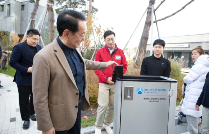 스마트시티기반구축본격화아파트2곳에로봇4종배치바리스타·순찰·청소기능등혁신기술로생활서비스제공향후다양한일상분야확대지난16일강서구호반써밋스마트시티아파트에서김도읍의원이짐캐리(배송)로봇을살펴보는모습.부산시제공지난16일수자인아파트커뮤니티센터에서김형찬(오른쪽)강서구청장이바리스타로봇에대한설명을듣는모습.부산시제공아파트커뮤니티센터에서로봇이타주는커피를마시고,핸드폰알림을받고문을열면지하주차장에서집앞까지로봇이가져다준짐이도착해있다.부산강서구에코델타시티에조성되는스마트시티국가시범도시의일상이다.부산시는공공과민간이함께참여하는새로운도시개발모델을통해‘부산에코델타스마트시티국가시범도시조성’사업의핵심기반구축에본격적으로나선다고17일밝혔다.부산에코델타스마트시티국가시범도시조성사업은부산강서구일대에코델타시티세물머리구역2.8㎢(약84만평)빈땅에상업·업무·주거·문화시설등을만들고첨단IT기술을적용해미래스마트시티대표모델을조성한다.올해부터2039년까지구축5년,운영10년등15년간총5조6000억원이투입된다.국토교통부와한국수자원공사가주관하는국내최대규모스마트시티사업이다.이번사업은지난해12월부산시와한국수자원공사,부산도시공사와LGCNS,신한은행,현대건설등11개기업으로구성된민간컨소시엄이공동출자해사업시행을위한특수목적법인‘스마트시티부산주식회사’를설립하면서본격화됐다.법인에서발생하는수익은스마트서비스고도화와신규서비스개발등에전액재투자하는‘민관공동사업’방식이다.스마트시티부산(주)는향후5년간국가시범도시예정지내선도지구를조성해데이터기반도시운영,통합모빌리티,제로에너지,헬스케어,로봇등총25개의스마트서비스를구축하고운영하게된다.자율주행버스,스마트주차,가로등과스마트폰을연동해기상정보등을제공하는스마트사물인터넷(IoT),단지내에서보물을찾는스마트보물찾기게임등을준비하고있다.부산강서구에코델타시티내아파트단지두곳에도입되는로봇서비스4종.위왼쪽부터바리스타·청소·순찰·짐캐리(배송)로봇.부산시제공그첫발로에코델타시티호반써밋아파트와수자인아파트에서로봇혁신기술을도입해생활밀착형서비스를제공하는‘로봇도입시범사업’이시작됐다.지난16일오픈식에서선보인로봇4종은커뮤니티센터에서식음료를만드는바리스타로봇,단지내를자율주행으로돌면서화재나안전사고를감지하면관제실과관리사무소에통보하는순찰로봇,아파트공용공간을지정된시간에청소하는청소로봇과지하주차장에서집앞까지짐을나르는짐캐리로봇이다.두곳아파트에는4종로봇이총6대씩도입돼이날부터테스트운영을시작해내년부터정식서비스를하게된다.이밖에향후고층외부창을닦는창문청소로봇와입는형태로팔과허리근력을보조하는웨어러블로봇은유상대여로이용할수있도록도입을검토하고있다.이번로봇도입시범사업은공동주택에로봇통합관제플랫폼을도입해다양한기업이개발한로봇서비스를하나의플랫폼에서운영할수있는최초사례다.스마트시티부산(주)는앞으로로봇서비스범위를다양한일상분야로확대하고정교화할계획이다.박형준부산시장은“부산시를비롯한한국수자원공사,부산도시공사가공공부문출자자로서국가시범도시조성사업이차질없이추진될수있도록적극적인지원과공적역할을다하고,국토교통부등관계기관과긴밀히협력해나가겠다”고말했다.