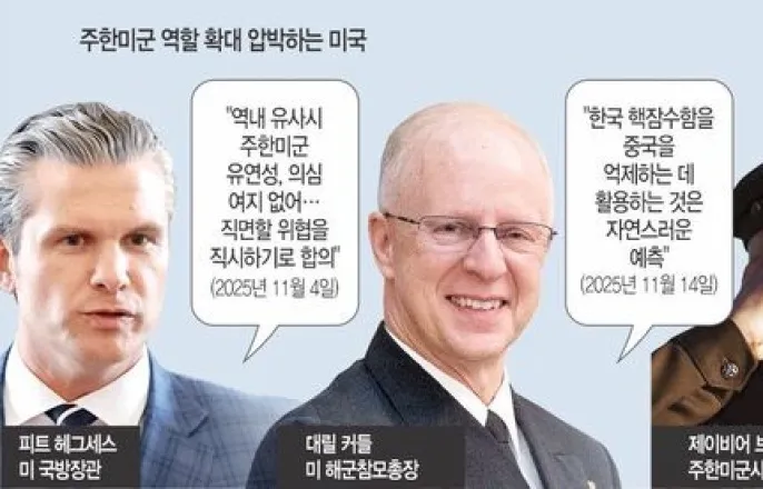 브런슨‘동북아억제작전’구체화평택·오산기지기능더강화할듯정부대북억제고수속대응부심동맹현대화와주한미군의역할변화를요구하는미국의압박강도가고조되고있다.암묵적요구수준을넘어실제작전계획과연합훈련에적용될수있는구체적군사계획까지구체화했다.미국이동맹현대화를완성하기위한군사적방향성을선명히하며주한미군역할조정에본격적으로속도를내고있다는분석이다.정부는“현재수준의전략적유연성을유지할것”이라며반대의사를분명히했지만미국의전방위적요구에대응방안을부심하고있다.제이비어브런슨주한미군사령관은17일주한미군홈페이지에게시한‘뒤집힌지도(East-UpMap)’글에서주한미군을중·러에맞설‘근접전력’으로규정했다.그의발언에는주한미군을한반도방어중심에서벗어나중·러까지포함하는다중억제축으로확대해야한다는구상이담겼다.구체적으로주한미군이동해에서는러시아함대진출을,서해에서는중국북부전구군과북부함대움직임을제한할수있다고설명했다.전략적담론을소개하는데그치지않고,어떤적(중·러)을상정할지,어느전구(서해·동해·인도·태평양)에서,어떤군사효과를낼지까지명시했다.미국의동맹현대화요구는정책제시를넘어작전구상까지확대되고있다.피트헤그세스미국방장관은지난4일제57차한·미안보협의회(SCM)를마친뒤“주한미군이역내유사시유연성을갖는것에의심의여지가없다”고말했다.대릴커들미해군참모총장은14일“한국이핵잠수함을중국억제에활용하는건자연스러운예측”이라고언급했다.같은날발표된SCM공동성명에선매년포함되던주한미군의‘현수준유지’문구가빠졌다.군안팎에선미국이한반도방어전력인육군위주배치에서벗어나해·공군을포함한다층적전력구성을염두에둔신호라는해석이나왔다.여기에브런슨사령관이중국억제역할을넘어북·중·러를포괄하는3방억제전력으로재정의해야한다는구상을추가로제시한것이다.한반도를출발점으로동·서해와일본,필리핀을연계한억제작전을구현하겠다는구체적복안까지내놨다.주한미군이동북아시아전역에서작전효과를발휘할수있는구조로재편될가능성을예고하는대목이다.주한미군관계자는“브런슨사령관이평소가지고있는전략적관점을한국국민에게직접설명하기위해글을쓰게됐다”고전했다.미국은주요주한미군기지인경기도평택캠프험프리스와오산공군기지의지휘·작전기능을점차강화할것으로전망된다.군관계자는“험프리스와오산기지를단순후방지원시설에서벗어나북한을넘어중국과러시아까지억제할수있는근접전력허브로활용하겠다는분명한메시지”라고평가했다.우리정부는노골화하는미국의압박속에서주한미군역할을조율해야하는과제를안게됐다.정부차원의구체적대응전략이시급하다는목소리도나온다.군당국은주한미군역할의중심은여전히한반도대북억제라는기존입장을재확인했다.국방부당국자는“이번SCM에서새로운병력조정이나주한미군역할확대등실질적변화는합의되지않았다”며“과거에존재하던전략적유연성원칙을다시확인한수준으로,한반도방위중심의기존정책과원칙은유지된다”고말했다.송태화기자[email protected]ⓒ국민일보(www.kmib.co.kr),무단전재및수집,재배포및AI학습이용금지Copyright©국민일보.무단전재및재배포금지.