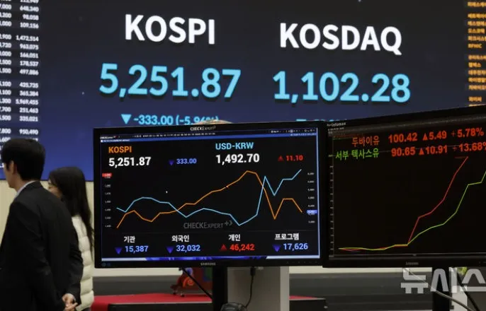 코스피장중8%대급락으로'서킷브레이커'발동원·달러환율1500원선위협…금융위기이후최고[서울=뉴시스]김혜진기자=미국과이스라엘의이란공습에따른중동정세불안여파로국제유가의기준점역할을하는브렌트유와서부텍사스산원유(WTI)가모두배럴당100달러를넘긴9일오후서울영등포구한국거래소전광판에서부텍사스산중질유(WTI),두바이유선물가격이표시되고있다[email protected][서울=뉴시스]조현아기자='중동사태'장기화우려로투자심리가급격히얼어붙으면서9일금융시장이크게흔들렸다.국제유가가장중배럴당100달러선을넘어선가운데원·달러환율은1500원선을위협하고,코스피지수는장중8%대폭락세를나타냈다.이날한국거래소에따르면코스피는전거래일대비319.50포인트(5.72%)내린5265.37에거래를시작한뒤전거래일보다333.00포인트(5.96%)내린5251.97에거래를마감했다.장초반매도사이드카가발동된데이어,오전10시31분께전일대비8%이상하락한상태가1분간지속되면서서킷브레이커가발동됐다.시가총액상위종목들도일제히약세를나타냈다.삼성전자는전거래일대비7.81%하락한17만3500원에거래를마쳤다.장중하락폭이커지면서17만원선밑으로내려오기도했다.SK하이닉스는9.52%,현대차는8.32%의하락세를보였다.수급별로는개인이나홀로4조6254억원어치를순매수했지만,외국인과기관이각각3조2048억원,1조5331억원을순매도하면서지수를끌어내렸다.코스닥도전거래일보다52.39포인트(4.54%)내린1102.28에거래를마쳤다.코스닥시장에서도장중7%대하락세를보이며오전10시31분께매도사이드카가발동됐다.개인과기관은각각5186억원,478억원을순매수하며지수하락을방어했지만외국인이5451억원어치를순매도했다.[테헤란=AP/뉴시스]미국-이스라엘군사작전중도시를강타한공격으로석유저장시설에서불길과연기가치솟자주민들이지켜보며사진을찍고있다.2026.03.07.원·달러환율은1500원대턱밑까지올랐다.서울외환시장에서원·달러환율은전거래일보다19.1원오른1495.5원에마감했다.이날오전전거래일대비16.6원오른1493.0원에출발한뒤장중한때1499원을넘어서면서1500원에근접하는모습을보였다.글로벌금융위기였던2009년3월12일(장중1500원)이후약17년만에가장높은수준이다.이는미국과이란의충돌에따른중동발지정학적리스크가한층고조된영향이다.호르무즈해협봉쇄와중동주요산유국들의감산영향으로국제유가가급등하면서금융시장은공포에휩싸였다.뉴욕상품거래소에서미국서부텍사스원유(WTI)4월물선물가격은한국시간오전8시58분기준전거래일대비18.70%오른배럴당107.90달러에거래됐다.장중한때111.24달러까지오르기도했다.국제유가기준인브렌트유5월물선물가격도16.19%오른배럴당107.70달러에거래됐다.국제유가가배럴당100달러를넘어선것은러시아가우크라이나를침공했던지난2022년6월말~7월초이후처음이다.[서울=뉴시스]황준선기자=중동정세악화로원·달러환율이상승하고있는9일서울중구명동의환전소에서달러등외화거래가가표시돼있다[email protected]아시아증시도함께요동쳤다.이날일본도쿄증시에서닛케이225지수는장중7%대급락했고,전거래일대비5.20%떨어진5만2728.72에마감했다.5만3000선아래로떨어진것은지난달6일이후처음이다.문다운한국투자증권연구원은"이란전쟁발발로경기확장기대감을지지하던요인이빠르게약화될것"이라며"4~5주이내에갈등이소강되는경우일시적심리훼손에그치겠지만,장기화될경우심리지표를거쳐실물지표까지부정적파급효과가불가피하다"고전망했다.박상현iM증권연구원은"이란사태장기화우려가확산될경우유가100달러는물론고유가장기화리스크가가시화될수있다"며"글로벌자금의안전자산선호현상을강화시켜달러화의추가강세를촉발시키면서유가추가급등시원·달러환율이1500원선을돌파할가능성도크다"고말했다.☞공감언론뉴시스[email protected]©뉴시스.무단전재및재배포금지.