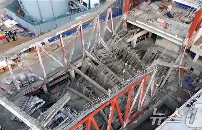 사고지점규모가로48m,폭20m규모로넓어소방,마르는콘크리트일일이제거하며매몰자접근11일오후1시58분쯤광주서구치평동(상무지구)의광주대표도서관공사현장에서레미콘타설중붕괴사고가발생해4명이매몰됐다.사진은사고현장모습.(소방청제공.재판매및DB금지)2025.12.11/뉴스1ⓒNews1(광주=뉴스1)최성국기자=소방당국이야간에광주대표도서관건설현장에매몰된근로자3명을구조·수색하는작업이'콘크리트자연양생'으로인해난항을겪고있다.안균택광주서부소방서예방안전과장은11일오후7시광주서구치평동광주대표도서관붕괴사고관련브리핑을열고"사고지점에대한안정화작업이우선돼야하기때문에대형크레인2대를동원,H빔과콘크리트구조물고정작업을시작했다"고말했다.안과장은"오후2시53분에발견된매몰자에대한구조작업은병행되고있다"며"구조작업이더디게진행되고있다.발견당시보다는진척이상당히있는상황"이라고설명했다.그는"H빔과콘크리트가뒤엉켜있다.일일이절단하면서매몰자에게접근해야하는상황"이라고부연했다.특히이날사고는옥상층에콘크리트를타설하는과정에서발생했는데,이콘크리트수분이마르면서엉키고설킨철골구조물과콘크리트사이를굳혀소방당국의구조작업을더디게하고있다.사고현장에흩뿌려진이콘크리트가자연적으로마르면서소방당국은호미로일일이긁어가며제거작업중이다.옥상부터지하까지붕괴된규모는데크플레이트를지지하는기둥과기둥사이로,길이48m에폭20m규모로파악됐다.붕괴원인으로지목되는'지지대미설치'에대해서는"지지대설치가필요하지않은공법으로진행됐다"고설명됐다.그러나구일종합건설관계자는해당브리핑에서"해당공법이콘크리트와구조물등하중을얼마까지버틸수있는지는구조검토보고서상에는나와있지않다"고밝혔다.소방당국은열화상카메라등을동원해아직발견되지않은매몰자2명에대한수색작업도철야로진행한다.구조당국은미발견된근로자2명은사고지점내에매몰돼있을가능성이높은것으로보고있다.이날사고는공사현장레미콘타설작업중벌어졌는데,현장에서는지난주부터철근배근작업이있었으며타설은이날착수한것으로확인됐다.사고당시옥상층에근무하던A씨(47)는오후2시25분구조돼심정지상태로긴급이송됐으나끝내숨졌다.김영훈노동부장관도이날오후7시50분쯤사고현장에도착,사고현장을살펴보고있다.광주대표도서관은총사업비516억원을투입해광주시종합건설본부가발주하고흥진건설과구일종합건설이공동으로시공을맡고있다.옛상무소각장을문화공간으로조성하기위해2022년9월착공,2026년4월완공을목표로약1만1286㎡부지에지상2층,지하2층규모의철근콘크리트구조물건립공사가진행중이었다.현재까지공정률은약73%다.대표시공사였던홍진건설의자금난으로공사가중단,공동도급을맡은건설사들이잔여공사를승계하는과정에서공사가3개월간미뤄졌다[email protected]©뉴스1.Allrightsreserved.무단전재및재배포,AI학습이용금지.