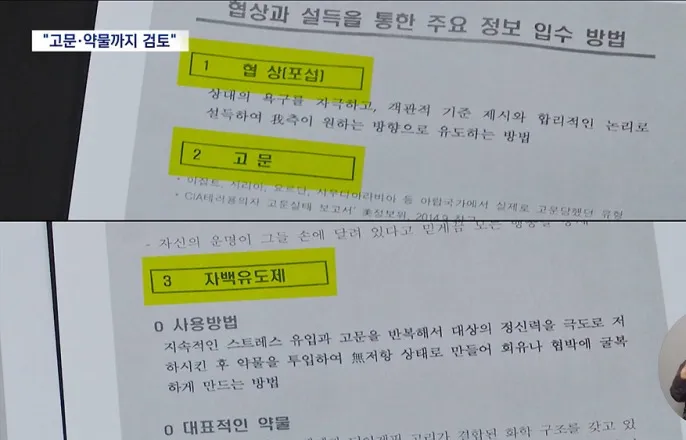 [뉴스데스크]◀앵커▶12.3내란당시노상원전정보사령관등이허위자백을받아내기위해,마약류마취제등약물까지사용하려던걸로보이는정황이드러났습니다.더불어민주당박선원의원이군내부문건을입수했다며폭로한내용인데요.고문에쓰이는작두와야구방망이등을준비한건이미드러났는데,여기에약물까지‥국방부도이사안을들여다보기로했습니다.이기주기자가보도합니다.◀리포트▶국회국방위원회소속더불어민주당박선원의원이,공개한군내부문건입니다.박의원측이제보자보호를위해내용만정리해공개한문건에는협상과고문,자백유도제등의소제목이적혀있습니다.특히고문은아랍권에서실제사용됐던유형으로미중앙정보국고문보고서를참고했다고돼있습니다.문건에는눈가리고나체상태로장시간방치해체온저하시키기,수건으로얼굴덮고물붓기,벌레나개등을이용해공포심유발하기등신체적고문방법을사용하고,정신적고문은독방에감금시켜외부소식차단하기,가족에대한위해와협박하기,평생불구자로만들겠다고위협하기등을하라고돼있습니다.이래도안되면마취제의일종인벤조디아제핀과펜토탈나트륨,프로포폴과케타민등을사용해무저항상태로만든뒤자백을유도하는3단계방안이나와있습니다.이를폭로한박의원은"윤석열김용현노상원등이내란에성공한뒤고문과약물등으로반대진영의정치인과시민들을굴복시켜진술을조작하려한것"이라고주장했습니다.[박선원/더불어민주당의원]"정치인과시민을잡아가두고고문,협박해내란세력이바라는영구독재,전체주의국가를만들려고했던것아닙니까?사람을치료할약을가지고사람을부수고,죽이고,파멸시키는…"실제로노상원문상호등이사령관을지낸정보사는선관위직원들을위협하기위해작두와야구방망이등고문도구를준비했다고실토한바있습니다.[정성욱/당시정보사령부대령(지난1월14일)]"<작두를왜준비를했죠?>노상원사령관하고문상호사령관이먼저저희를호출을해서나갔을때그노상원사령관이물품을구입하라고이야기를했고…"박의원측은내란수개월전이문건을작성한지휘관이문건을들고모처에다녀온뒤노상원이고문기구를준비시켰다고주장했는데,이에대해국방부는"특별수사본부에서수사를통해사실관계를명확히확인할예정"이라고밝혔습니다.MBC뉴스이기주입니다.영상편집:허원철/영상편집:윤치영MBC뉴스는24시간여러분의제보를기다립니다.▷전화02-784-4000▷이메일[email protected]▷카카오톡@mbc제보영상편집:허원철/영상편집:윤치영이기주기자([email protected])기사원문-https://imnews.imbc.com/replay/2025/nwdesk/article/6784431_36799.htmlCopyright©MBC&iMBC무단전재,재배포및이용(AI학습포함)금지