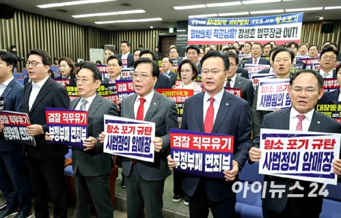 의총개최…중앙지검'대장동항소포기'총공세대통령탄핵도언급…"'외압'몸통이라는점모두동의"'현안질의·국조·청문회·상설특검'요구도…與"대상아냐"'김기현클러치백'특검조사,언급자제…"'항소포기'당력집중"국민의힘송언석원내대표와의원들이10일오후서울여의도국회에서열린의원총회에서대장동사건항소포기를규탄하는구호를외치고있다.[사진=곽영래기자][아이뉴스24유범열기자]서울중앙지검대장동사건관련자항소포기와관련해국민의힘이지휘라인인정성호법무부장관과노만석검찰총장직무대행의사퇴를선제적으로요구하고나섰다.당은이들이응하지않을경우이들에더해이재명대통령에대한탄핵소추안발의까지검토하겠다는방침이다.송언석원내대표는10일오후국회에서열린의원총회후기자들과만나"이번항소포기사태가대한민국사법체계를파괴하는굉장히중차대한사태라는점에총의를모았다"며"이사태를좌시하지않고,정장관과노대행을비롯한항소포기외압관련자들이즉각사퇴해야한다는데의원들의의견을모았다"고밝혔다.국민의힘은우선내일(11일)대검찰청과법무부를항의방문하고규탄대회를개최할방침이다.송원내대표는"현재개최시간을조율중"이라고설명했다.다만정장관이이날오전"대검에항소포기지침을내린적이없고여러사정을고려해대검찰청에신중히판단하라는의견을전달했을뿐"이라며'수사외압'의혹을정면반박한만큼,사퇴요구가수용될가능성은낮다는게정치권의관측이다.국민의힘은정부가별다른조치를취하지않을경우노대행과정장관은물론,항소포기의'최종결재자'로보고있는이대통령에대한탄핵발의도검토하겠다는입장이다.헌법상탄핵소추안발의는국회재적의원3분의1이상동의로가능해,국민의힘단독으로도절차상추진이가능하다.앞서장동혁대표도오전충북청주에서열린현장최고위원회의에서항소포기와관련해이대통령책임론을지적하며"명백한직권남용이자'탄핵사유'"라고언급한바있다.송원내대표는"이번항소포기외압의몸통이이대통령이라고하는점에대해선모두가인식을함께하고있다"며"향후이부분에대해정부가반응이없을경우추가적으로어떻게진행할것인지,지금탄핵을추진할수있을지의원들과좀더논의하기로했다"고밝혔다.당은국회본회의현안질의와국정조사,나아가청문회·상설특검진행도여당에재차요구했다.송원내대표는"어제김병기원내대표도국정조사·청문회·상설특검을할수도있다고했고,의원들의총의를모은결과우리도무엇이든지다할수있다고의견을모았다"며"이중빨리할수있는본회의현안질의와국정조사는여야간즉각협의를실시하기로총의를모았다"고밝혔다.다만여야가국정조사등현안질의이상절차의성격을두고이견을보이면서협의가난항을겪을가능성도제기된다.현재민주당은대장동사건관련검찰의기소자체가조작됐다는취지로주장하는반면,국민의힘은검찰의항소포기로인해범죄수익금환수가무산됐다며외압경위등을규명해야한다는입장이다.문진석민주당원내운영수석부대표는이날경기이천에서진행된전국지역위원장워크숍에서기자들과만나"항소자제에대한것은국정조사사안이아니다"라고선을그은바있다.여기에국민의힘의본회의현안질의요구를두고도"법제사법위원회전체회의서하면되고본회의까지끌고갈문제는아니다"라고일축했다.이에대해송원내대표는"결국양당이문제삼는사안이다르더라도,출석해야할관계자는동일하기때문에절차진행에는무리가없을것"이라고반박했다.한편지난2023년전당대회에서당대표에당선된김기현의원의배우자가전대직후윤석열전대통령부인김건희여사에게명품브랜드의클러치백(손가방)을선물한것과관련해,'대가성'의혹이제기되는것을두고당은별도대응을자제하는분위기다.최은석원내수석대변인은관련논의여부를묻는질문에"특별히얘기가없었다"고답했다.당내에선'항소포기'공세에당력을집중해야할시기관련논란이불거진데대해일부부담을느끼는기류도감지된다.의총에참석한한초선의원은통화에서"논의대부분이항소포기에대한대응방안에집중됐다"면서도"당이여론전을펴는데있어마이너스가될것이라는우려는있다.본인대응을우선더지켜봐야하지않겠나"라고말했다.다른중진의원도통화에서"특별히얘기가없었다.항소포기가너무큰이슈가돼버렸다"면서"김의원논란은(이후상황을)좀더지켜봐야할문제"라고말했다./유범열기자([email protected])Copyright©아이뉴스24.무단전재및재배포금지.