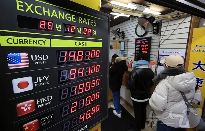 원·달러환율의오름세가계속되고있는22일서울중구명동환전소전광판에나오는원달러환율시세.2025.12.22/뉴스1ⓒNews1김진환기자(서울=뉴스1)정지윤기자=달러·원환율이엔화약세와달러실수요매수세에계엄정국이었던지난4월이후8개월만에1480원대로마감했다.22일서울외환시장에따르면이날달러·원환율은전일종가대비3.8원오른1480.1원으로마감했다.이는오후3시30분종가기준지난4월9일(1484.1원)이후약8개월반만에최고치를기록한것이다.이날환율은전일종가대비1.7원오른1478.0원에출발한뒤1470원후반대를횡보했다.이후오후1시30분쯤에는1481.5원까지오르기도했다.이는환율이지난17일장중1482.1원을기록한지3거래일만에또다시1480원대를돌파한것이다.최근환율상승은일본은행(BOJ)의추가금리인상기대후퇴로엔화가치가급락하면서달러가강세를보이고있는영향을받은것으로풀이된다.지난19일BOJ가기준금리를0.25%포인트(p)올려0.75%로결정했지만,우에다가즈오BOJ총재가향후구체적인금리인상속도에대해구체적인설명을피하면서엔화약세는가속화됐다.민경원우리은행이코노미스트는"이번BOJ는충분히매파적이지않았다는평가가팽배해지며엔화매도세가출회했다"며"달러화는엔화가치의급락속강세를보였다"고분석했다.권아민NH투자증권연구원은"4분기이후엔화는원화와함께통화가치하락폭상위"라며"엔화약세가약달러압력을일부희석할것으로보이며이또한원화가치의반등을저해할것으로판단된다"고내다봤다.시장에서는당국의개입경계감속연말달러·원환율종가를1400원대후반으로예상하고있는상황이다.이민혁국민은행연구원은"최근달러·원환율은1480원을상회하며1500원레벨을위협하는고환율구간에진입했다"며"올해거래일이불과6영업일남은상황속정부의연말종가관리성달러매도개입도가능한상황"이라고분석했다.권아민연구원은"당국이추가로내놓을수있는조치는제한적이고국민연금의환헤지단행여부정도에기대를거는상황"이라며"국내투자로보는수급은꾸준히달러매수우위로판단되기에,연말종가역시1400원대중후반에서형성될가능성이높다고판단된다"고분석했다[email protected]©뉴스1.Allrightsreserved.무단전재및재배포,AI학습이용금지.