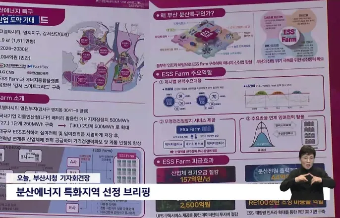 <앵커>지역에서생산한전기를지역에값싸게공급할수있는분산에너지특화지역에부산이최종선정됐습니다.산업단지는물론전기를많이쓰는데이터센터도혜택을받을수있어향후반도체등첨단기업을유치하는데큰도움이될전망입니다.김민욱기자가보도합니다.<기자>부산강서구르노코리아공장은한해80기가와트시(GWh)의전기를사용해요금만무려90억원에달합니다.르노코리아뿐아니라모든기업입장에서도전기료는예민한문제입니다.하지만분산에너지특화지역선정으로전기요금부담을획기적으로줄일수있게됐습니다.기후에너지환경부가에너지위원회에서최종후보7곳가운데부산,전남,경기,제주등4곳을선정한것입니다.부산의특구대상지역은에코델타시티,명지지구,강서권6개산단입니다.에코델타시티에에너지저장장치ESS를설치해심야시간충전한전력을피크시간대활용하는방식입니다.{박형준/부산시장/"(부산형분산에너지특구는)이용률이낮은심야전기를소비자중심의거래가가능한새로운에너지구조로전력흐름을분산시키고출력제한등으로버려질수있는전력도저장해(활용함으로써...)"}2030년까지500메가와트시규모로구축되는데,이는4만2천가구에하루동안공급할전력량입니다."이번분산에너지특화지역지정으로기업별로최대8%수준의전기요금을절감할수있을것으로기대됩니다.금액으로환산하면연간157억원에달합니다."{박재덕/엔솔브SK이노베이션E&S대표(에너지저장장치구축기업)/"기존에는산업체가10개가있다고하면ESS를열군데설치해야했는데그러다보니까효과가굉장히떨어졌습니다.그런데저희들은한곳에ESS팜(에너지저장장치집적시설)으로설치함으로써(효율성을높일수있습니다.)"}특히막대한전기를사용하는데이터센터가혜택을받을전망으로기업들의기대가높습니다.{천상규/파나시아기업부설연구소장/"저희산업계에서추진하고있는친환경신기술기술개발에대한어떤속도감을조금더낼수있는그런시너지효과가있지않을까(생각합니다.)"}기존전력시장을거치지않고지역내에서생산한전기를값싸게이용할수있는만큼반도체등첨단기업유치에도힘이실릴것으로기대됩니다.KNN김민욱입니다.영상취재정성욱편집이소민CG최희연김민욱기자([email protected])KNN뉴스는24시간여러분의제보를기다립니다.▷전화:(부산)051-850-9000/(경남)055-283-0505▷제보이메일[email protected]▷카카오톡친구찾기@knnCopyright©KNN.Allrightsreserved.무단전재,재배포및이용(AI학습포함)금지