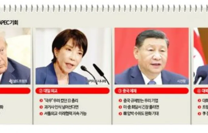 寒微관세협상'최대현안'안보접점찾아,협력강화할듯北美회동땐대북관계도청신호韓日정상회담,'셔틀외교'탈선없이지속아시아태평양경제협력체(APEC)정상회의개막을앞두고세계의시선이경주로쏠리고있다.세계무역질서와안보환경이불안정한상황에서미국,중국,일본등주요국정상들이모습을드러내기때문이다.이재명대통령에게도대외리스크를해소할절호의기회가주어졌다.취임직후부터이어졌던한미관세협상을마무리짓고,미국과의안보협력을공고히다질가능성이있다.미래지향적한일협력과대북관계등한반도현안에도물꼬를틀여건을조성할수있다는점에서이번정상회의에대한관심이크다.한미관세협상타결의분수령한국입장에서APEC기간최대현안은한미관세협상이다.지난7월말큰틀의관세협상을타결했으나대미투자펀드의세부이행방안을두고두달가까이교착상태에빠졌다.다행히10월초한국정부의수정안에미국정부가진전된반응을보이면서협상은다시급물살을타기시작했다.김용범대통령실정책실장을포함해김정관산업통상부장관등협상책임자들은2~3일간격으로재차방미에나서는등총력전을펼쳤다.양측은최근상호관세율을25%에서15%로낮추고자동차등품목별관세를낮추는방향을놓고막판합의문문구를다듬고있다.관건은대미투자패키지의구조와자금집행방식이다.3500억달러(약500조원)규모대미투자에서'현금·대출·보증'비중을어떻게섞을지,일시에집행할지분할로갈지,투자에따른수익배분을어떻게할지,외환시장충격을흡수할금융안전장치를어디까지문서화할지가관건이다.극적인타결을이룬다면통상·외환시장과관련불확실성이줄고,자동차·부품·철강관련기업들의부담도크게감소할전망이다.대미투자패키지가매듭지어지면한미안보이슈가뒤따를가능성이높다.국방예산의점진적증액기조를재확인하고,미국산무기구매·공급망협력을'경제안보'프레임으로연결하는시나리오가거론된다.특히원자력협정운신의폭을넓히는방향성문구가담길지관심이다.이는사용후핵연료·핵연료주기와직결되는민감사안이어서일괄타결보다는단계적·조건부합의가현실적이다.관세와안보가'따로가는'이원화가아니라,상호신뢰를강화하는선순환고리를만들수있다면동맹리스크는눈에띄게낮아질수있다.특히원자력협정운신의폭을넓히는방향성문구가담길지관심이다.이는사용후핵연료·핵연료주기와직결되는민감사안이어서일괄타결보다는단계적·조건부합의가현실적이다.관세와안보가'따로가는'이원화가아니라,상호신뢰를강화하는선순환고리를만들수있다면동맹리스크는눈에띄게낮아질수있다.접점찾아가는韓美안보협의통상분야에비해안보분야협의는어느정도접점을찾은상황이다.이에대미투자패키지협의만마무리되면통상·안보협상결과가한꺼번에발표될가능성이높다는게대통령실설명이다.위성락국가안보실장은APEC관련기자간담회에서"안보분야는일정한양해가이뤄졌다"면서"미국측은통상·안보두가지가모두완성됐을때한꺼번에발표하는것을선호한다"고말했다.다만상황은녹록지않다.한미협상팀은대부분의사안에서합의에이르렀지만몇가지쟁점에서이견을좁히지못했다.김실장도APEC전마지막협상을하고돌아오는길에기자들과만나"추가로대면협상할시간은없고APEC은코앞"이라면서"날은저물고있는데APEC계기타결을기대한다면갈길이먼상황"이라고말했다.특히대통령실은APEC기간에한미가합의된부분만따로발표하는일은없을것이라며일괄타결을공언한바있다.따라서관세협상을마무리하지못하면29일에열리는한미정상회담에서양해각서(MOU)등의결과물이전혀나오지않을수있다.韓日정상회담,셔틀외교방향타다카이치사나에신임일본총리와의관계설정은주어진숙제이자기회다.APEC기간방한하는다카이치총리는강경보수이미지를가지고있다.이에외교가에서는한일관계에균열이생길수있다는우려가있었다.하지만경주에서한일정상이상호신뢰를구축하고과거사문제를'투트랙'으로하는원칙에공유한다면셔틀외교레일을탈선없이이어갈수있다.과거사·안보쟁점은분리해관리하면서경제현안에서신뢰를쌓아가는식이다.이과정에서미국과의관세패키지,미·중경쟁속공급망다변화와도자연스럽게맞물릴것으로보인다.中시진핑주석방한,경제활로열리나차기APEC개최국인중국의시진핑국가주석과는내달1일첫한중정상회담에서우리기업제재완화와관련한얘기를주고받을예정이다.앞서중국정부는한화오션미국자회사를제재하고희토류수출통제를강화하겠다고발표한바있다.중국의조치는APEC및미·중정상회담을앞두고공세를높이기위한성격이크다.양국산업통상담당자들은APEC정상회의를지렛대삼아논의를지속하기로했는데,미·중정상이상호적대적인보복조치를완화할경우중국의우리기업압박수위도다소누그러질여지가생긴다.트럼프·김정은만남,변화의모멘텀현실성은낮지만도널드트럼프미국대통령이김정은북한국무위원장과전격회동한다면대북관계에서청신호가켜질것으로보인다.이대통령은취임이후북한과의대화를도모해왔지만유의미한변화를끌어내지못했다.북·미가판문점등상징적공간을활용해짧게라도만나면남북이상호강경수