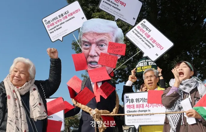 도널드트럼프미국대통령이방한한29일경북경주시구황교네거리에서‘2025APEC반대국제민중행동조직위원회’활동가들이트럼프방한규탄기자회견을하고있다.이준헌기자도널드트럼프미국대통령이아시아태평양경제협력체(APEC)정상회의참석차방한한29일경주도심곳곳에서찬반시위가잇따랐다.진보정당과노동·인권·환경단체등은트럼프대통령의관세전쟁과3500억달러투자요구,반인권·반환경정책등을비판했다.보수단체들은방한환영입장과함께윤석열전대통령지지및이재명대통령퇴진등을요구했다.이날오전11시쯤경주시동천동구황교인근에는“노킹스(NoKings),노트럼프(NoTrumph)!”구호가울렸다.최근미국전역에서일고있는현지반트럼프시위에서자주등장하는문구다.37개단체로구성된2025APEC반대국제민중행동조직위원회(국제민중행동)는이곳에서기자회견을열고“APEC을명목삼아관세폭탄으로다른나라평범한사람들의삶과경제를수탈하는트럼프를규탄한다”고밝혔다.이어“인공지능(AI),고령화,식량안보,에너지등다양한APEC의제가있지만,모든관심은트럼프의관세전쟁에만쏠려있다.APEC은트럼프의원맨쇼로끝날것”이라고주장했다.기자회견에는권영국정의당대표,이재동전농경북도연맹의장,최현환금속노조한국옵티칼하이테크지회장등이참석했다.국제민중총회(IPA)의비자이프리샤드,국제평화국(IPB)공동대표코라손파블로스등의해외연사도참여했다.도널드트럼프미국대통령이방한한29일경북경주시구황교네거리에서‘2025APEC반대국제민중행동조직위원회’활동가들이트럼프방한규탄기자회견을하고있다.이준헌기자비자이프리샤드는“유엔은팔레스타인집단학살에대해침묵하는것도이학살에대해동조하고있는것이라고했다”며“트럼프역시전쟁범죄자”라고지적했다.권영국대표도“미국은우리나라를비롯해여러나라에투자를요구하고있는데,이러한겁박은미제국주의가자신의힘을가지고약탈과불평등을강요하는것“이라고비판했다.집회참가자들은트럼프대통령탈을쓴사람을포승줄에묶고“노트럼프”“왕을위한나라는없다”등이적힌레드카드를붙이며규탄퍼포먼스를벌였다.‘한국은머니머신’‘기후위기는사기극’‘이민자가미국의피를오염시킨다’등트럼프대통령이한논란의발언도적혔다.옛경주역앞에서민주노총과국민주권당도이날오후옛경주역에서각각트럼프경제정책에반대하는집회와행진을진행했다.금속노조한국옵티칼하이테크지부는경주용강동인근에서일본기업니토덴코(NittoDenko)를규탄하는행진을벌였다.경주시황남동내남네거리일대에서29일환동해애국시민연대가‘경주APEC트럼프미국대통령방한환영국민대회’를개최하고있다.김현수기자동궁과월지일대에서열린반미성향집회에참석중이던60여명은한미정상회담이열리는경주박물관으로진입을시도했다가경찰에의해저지됐다.‘NOTrump,대미투자철회’라고적힌현수막을든이들은한때경찰과물리적충돌을빚었으나부상자는발생하지않았다.이날오후1시30분쯤경주시황남동내남네거리일대에서는환동해애국시민연대의‘경주APEC트럼프미국대통령방한환영국민대회’가열렸다.집회에참석한500여명은각자미국성조기와태극기를들고“트럼프만세,USA만세,윤석열만세”등을외쳤다.한참가자는“트럼프대통령님이그냥한국에오신것이아니다.무너진자유민주주의를재건하러오신것”이라고말했다.이곳에서직선거리로600m정도떨어진경주시노동동봉황대광장에서도보수단체인‘자유대학’이1000명규모의집회를열었다.이단체는윤석열전대통령탄핵국면에서윤전대통령을지지하고‘부정선거’주장에동조하고있는단체다.도널드트럼프미국대통령이APEC정상회의참석차방한한29일경북경주시구경주역에서민주노총조합원들이‘경제수탈,일자리파괴!트럼프방란반대결의대회’를하고있다.이준헌기자‘윤석열대통령’이라고적힌점퍼를입은대학생과‘이재명구속’등이적힌모자를쓴20대들은중국혐오를부추기는발언등을이어갔다.박준영자유대학대표는“지금대통령자리에앉아있는사람은가짜다.부정선거로당선된대통령”이라며“진짜대통령의자리를뺏은가짜대통령을당장끌어내야한다”고외쳤다.경찰은이날경주시내곳곳에서벌어지는집회안전관리에인력약8000명을배치했다.APEC기간중최대1만9000여명의경찰력을동원할수있는준비태세도갖췄다.이날까지APEC과관련해경찰에신고된경주지역집회는총27건이다.경주|김현수기자[email protected],경주|강정의기자[email protected]©경향신문.무단전재및재배포금지.