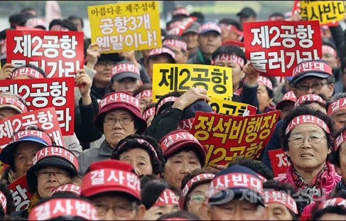 [제주제2공항발표10년]깜깜이입지-검증부실의혹꾸준해법없는소모전속'제주도의시간'도민직접참여변수2017년11월제2공항반대온평리비상대책위원회의제주제2공항반대집회현장.ⓒ제주의소리자료사진10년의갈등으로번질것이라곤누구도예상하지못했다.2015년11월10일정부가제주제2공항서귀포시성산읍입지를발표한순간부터오늘날까지제주제2공항은첨예한찬반갈등속에서헤어나지못하고있다.되돌아보면제2공항은단순한국책사업이아니라제주사회내부균열을촉발한분기점이됐다.제2공항을두고도민사회는찬반으로첨예하게양립했다.10년이라는긴시간동안어느한쪽으로무게추가쉽게쏠리지않는팽팽한형국이이어졌다.제2공항갈등이해소되지못하는가장큰원인은가치판단에정답이없기때문이다.경제적효과와관광수요확대를주장하는찬성측도,환경보존과항공안전성을우려하는반대측도각각의논거는충분했다.문제는일방적인발표로첫단추를잘못끼운것과,이후검증과정에서부실의혹이반복됐다는점이다.사업기획당시만해도제주의염원이었던제2공항은어느시점부터반대의목소리가더크게표출되기시작했다.수조원이투입되는국책사업을지역차원에서반대여론으로견제한다는것은현대사에서도찾아보기힘든일이다.갈등이길어지면서지역을동서로갈랐느니,토지보유여부에따라마을단위로갈라졌느니,곱지않은오명도더해졌다.당초계획대로라면10년이지난올해제2공항이이미완공됐어야한다는사실은웃지못할현실이다.결국제2공항은상처뿐인이름으로남겨졌다.◇'첫단추'부터잘못꿴입지발표...깜깜이선정논란자초2015년11월10일오후성산읍사무소에서열린제주공항인프라확충사전타당성검토용역결과주민설명회.연구책임자인김병종한국항공대교수가선정과정을설명하고있다.ⓒ제주의소리자료사진제주제2공항은입지선정과정에서부터논란을자초했다.제2공항은도민사회의염원속에서출발한사업이었다.다만제2공항추진목적의전제는'항공인프라확충'이었다.현제주국제공항의항공수요가포화에이르자이를해소하기위한대안을찾는과정에서비롯됐다.'제주신공항'으로불리던초기에는기존제주공항을대체할새로운입지를찾는방식이었지만,공항이전에따른도심공동화우려가제기되자기존공항을유지한채공항을추가하는방향으로선회했다성산읍입지발표는갑작스러웠다.국토교통부는최초제2공항입지를'성산읍신산리'로발표했다가신산리편입부지가극히일부라는지적이나오자'성산읍온평리'로변경했고,다시'성산공항'으로수정했다.발표당일에만두차례나명칭이바뀌었다.이는충분한준비가부족했음을보여줬다.아무런주민의견수렴없이단일입지를발표한것도갈등의불씨가됐다.당시정부는과학·기술적판단이필요한사안이라는이유와부동산투기우려를이유로발표직전까지입지를공개하지않았다.그러나그결정이결국악수가됐다.수용부지주민들을중심으로반대대책위원회가구성되며갈등이본격화됐다.가장기본적인단계라할수있는대안검토에서입지비교가제대로이뤄지지않았다는비판도뒤따랐다.환경영향평가협의회에서환경부등은복수대안을비교·검토하고장·단점을객관적으로기술하며최종선정사유를명시하도록했지만평가서는사전타당성용역에서부터제기된부실논란을그대로반영했다.2016년1월7일성산읍사무소소에서열린제주제2공항주민설명회가주민들의반발로인해파행을빚었다.국토교통부와제주도는당초성산국민체육센터에서설명회를개최할예정이었으나,주민반발에밀려장소를옮겼고,결국주민들의마음을돌리지못했다.ⓒ제주의소리자료사진◇항공수요예측'들쭉날쭉',제2공항추진근거'흔들'사업의근거가돼야할조사부실문제역시가장큰쟁점으로남았다.먼저제2공항의근거가된항공수요예측은들쭉날쭉했고,시간이흐를수록감소추세를보였다.2015년발표직전사전타당성조사에서는제주의장래항공수요를2030년기준4424만명으로예측했지만,2016년제5차공항개발종합계획에서는4179만명으로낮아졌다.최근2023년발표된기본계획안에서는2030년제주항공여객수요가3568만명으로제시됐다.항공수요4000만명돌파시점도기존2030년에서2055년으로대폭늦춰졌다.반면실제여객수는2019년3139만명을정점으로2024년에는2960만명수준까지감소했다.이를고려하면2025년항공이용객수역시3000만명을넘어서지못할것으로예상된다.기존예측치와최대1000만명가까운괴리가발생한것이다.이는국토부가제2공항의조속한건설을적극홍보했던것이무색해진수치다.또ADPi(파리공항공단엔지니어링)보고서누락으로대표되는검증부실문제가재차주목받는이유가됐다.당시ADPi는새로운공항건설대신기존제주공항용량확대로대체가가능하다는의견을제시했지만최종보고서에는반영되지않았다.◇숨골,조류충돌,소음등'부실평가'의혹여전제2공항예정부지인근동굴과숨골,조류충돌위험,항공기소음,멸종위기야생식물서식등다수환경요인도충분히검토되지않았다는비판이제기됐다.입지타당성검토단계에서부터자연환경평가범위가공간적·시간적으로과도하게축소됐다는지적이있었다.제2공항의경우동·식물상은계획지구로부터300m,조류는1km및주변철새도래지만대상으로