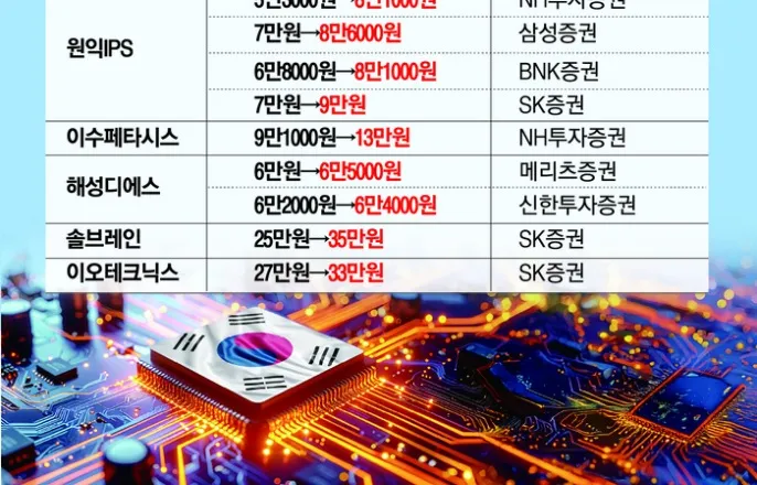 AI반도체거품논란지속에도메모리생산설비확대가능성증착장비제조하는원익IPS4개증권사서목표주가올려솔브레인·이수페타시스상향대장주삼성전자와SK하이닉스의주가가치솟는가운데증권가에선반도체소부장(소재·부품·장비)기업의목표주가도일제히올리고있다.인공지능(AI)발‘슈퍼사이클’에돌입한반도체산업의온기가완제품에이어제조공급망을구성하고있는기업들로확산될것이라는전망때문이다.10일증권가에따르면이날하루에만원익IPS,이수페타시스,솔브레인,해성디에스,이오테크닉스등다수의반도체소부장기업들의목표주가상향이이뤄졌다.특히이날원익IPS에대해삼성증권,NH투자증권,BNK증권,SK증권등4곳이상의증권사에서목표주가를올렸다.이가운데SK증권이기존7만원에서9만원으로가장높은목표주가를제시했다.원익IPS는반도체전공정에필요한증착장비를제조하고있다.증착은웨이퍼표면에얇은막을입히는반도체핵심공정이다.문준호삼성증권연구원은“AI수요가가파른성장을이어가며,메모리반도체증설계획상향가능성이높아지고있다”며“원익IPS의고객사인메모리업체들의3분기실적콘퍼런스콜에서도변화가감지된다”고목표주가상향조정이유를밝혔다.솔브레인도이날SK증권이25만원에서35만원으로목표주가를올렸다.솔브레인은반도체식각액,전구체,슬러리등을공급하는반도체소재대표기업으로꼽힌다.삼성전자와SK하이닉스의본격적인D램투자가시작되고,낸드플래시업황도AI수요로개선세를보이고있어식각액공급이늘어날것이라는이유에서다.SK증권은반도체장비업체이오테크닉스의목표주가도이날27만원에서33만원으로상향했다.이회사는레이저로반도체웨이퍼,칩,패키지등에식별정보를새기는레이저마커를주력으로생산하고있다.레이저마커는통상웨이퍼투입량에비례해매출이증가한다.반도체인쇄회로기판(PCB)제작업체인이수페타시스의경우에도이날NH투자증권이목표주가를9만1000원에서13만원으로크게높였다.AI연산량이늘어나면서고성능기판의수요가늘어나고있기때문이다.해성디에스에대해서도이날신한투자증권이기존6만2000원에서6만4000원으로,메리츠증권이기존6만원에서6만5000원으로목표주가를상향했다.국내메모리반도체고객사와차량용반도체고객사의수요증가세에주력인패키지기판과리드프레임의수익개선이기대된다는이유에서다.리드프레임은반도체칩과외부회로를전기적으로연결하고,칩을기판에고정하는역할을하는금속부품이다.오강호신한투자증권연구원은“패키지기판매출은단기사이클이아닌중장기구조적개선으로밸류에이션상향으로이어질것”이라며“리드프레임업황개선까지이어지며성장가속화구간에진입했다”고내다봤다.증권사들이반도체소부장기업들의주가를일제히올리는것은반도체슈퍼사이클에따른수요증가로증설을통한생산량확대가예상되기때문이다.늘어난물량에대응하기위한생산장비투자부터소재,부품까지산업전방으로온기가확산된다는것이다.이동주SK증권연구원은“삼성전자와SK하이닉스의D램투자로내년증설규모가각각11만장,10만장에달할것으로보인다“며“AI내메모리수요가폭증하고있는가운데공급이매우부족한상황에서2027년까지증설사이클은이어질것”이라고전망했다.Copyright©매일경제&mk.co.kr.무단전재,재배포및AI학습이용금지