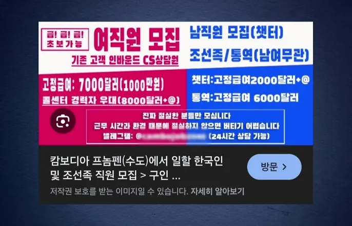 [앵커]캄보디아불법취업광고에대한경고의목소리가커지는가운데,YTN취재진이실제로구인광고를보고캄보디아에갔다가범죄단지에감금됐던피해자를만났습니다.구인글이재외한인회홈페이지에올라와별다른의심없이지원했다고하는데,결국한국인대학생이숨진뒤에야탈출할수있었습니다.표정우기자의단독보도입니다.[기자]20대한국인남성A씨는동남아여행중에한재외한인회홈페이지에올라온구인글을봤습니다.[A씨/캄보디아범죄단지감금:구인공고글을봤어요,(한재외한인회)사이트에서.하루몇시간일하면받을수있다.월급1,000만원보장.]별다른문제가없을것으로생각하고캄보디아행비행기를탄건지난4월,하지만A씨는곧범죄단지이곳저곳에물건처럼팔리며각종범행에가담해야하는신세가됐습니다.[A씨/캄보디아범죄단지감금:너는몸값5만불에팔렸다.계약기간5년에팔렸다.너는5년동안한국에못간다.그렇게말했고요.그때이제휴대전화도압수당했고….]마지막에도착한곳은보코산지역범죄단지로,A씨는한국인대학생박모씨가이곳에서숨진뒤에야이곳을탈출할수있었습니다.캄보디아에간지석달여만이었습니다.[A씨/캄보디아범죄단지감금:사망사실을알고서경찰급습해서그때구조해서이민국에있다가한국으로오게된것.]YTN취재진이살펴봤더니해당한인회홈페이지는이름등간단한정보만입력하면가입해글을쓸수있고,본인인증절차도따로없어서한사람이여러계정을만들수있었습니다.게시물내용도관리되지않다보니,결국비영리민간단체이자재외한인들이믿고정보를나누는한인회홈페이지마저해외범죄단체의표적이된겁니다.[캄보디아행광고게시된한인회관계자:등록은자유롭게해서아무나(게시글을)올릴수있게끔돼있어서요.]A씨가연락한취업광고속텔레그램아이디는삭제됐고광고가올라왔던게시판도폐쇄됐지만,지금도여기저기서비슷한구인글이한국인들을유혹하고있습니다.구인글에적힌번호로취재진이연락해봤더니범행수법을안내하며한달에천만원정도돈을벌수있다고소개합니다.[캄보디아조직모집책:(로맨스스캠은)그냥연인인것처럼하면서뭐오빠,오빠하면서그냥뭐만나줄것처럼(하면돼요.)스타트는(한달수입)8천달러인데한국돈으로는약1,150만원정도돼요.]경찰은앞으로불법구인광고게시자의계좌와IP등을추적하고,광고글을삭제하지않은사이트운영자에대해서도방조죄적용을검토할방침입니다.YTN표정우입니다.영상편집:김현준YTN표정우([email protected])※'당신의제보가뉴스가됩니다'[카카오톡]YTN검색해채널추가[전화]02-398-8585[메일][email protected][저작권자(c)YTN무단전재,재배포및AI데이터활용금지]Copyright©YTN.무단전재및재배포금지.