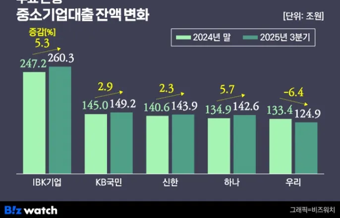 4대은행중기대출6.7조원↑…연체율0.53%IBK기업은행금융위기후처음1%대찍고지역경기'직격탄'지방은행도연체율1%넘어올해1~3분기중소기업대출을7조원가량늘린시중은행의중기대출평균연체율이0.5%를넘어선것으로나타났다.중기대출평균연체율이0.5%를웃돈건약8년만이다.내수부진에이자상환조차못한기업들이늘어난영향으로분석된다.주요은행중소기업대출잔액변화./그래픽=비즈워치6일KB국민은행,신한은행,하나은행,우리은행에따르면올해3분기4대은행합산기업대출잔액은780조원으로지난해말(767조원)대비13조원(1.7%)늘었다.증가액인13조원중절반인6조7000억원이중기대출로나갔다.이에중기대출잔액은지난해말553조9000억원에서올해3분기560조6000억원으로증가했다.KB국민은행이지난해말(145조원)에서올해3분기(149조2000억원)사이4조2000억원(2.8%),신한은행(140조6000억원→143조9000억원)은3조3000억원(2.4%)중기대출을늘렸다.하나은행은(134조9000억원→142조6000억원)시중은행중가장많은7조7000억원(5.7%)을확대했다.우리은행(133조4000억원→124조9000억원)만8조5000억원(6.4%)정도중기대출을줄였다.시중은행중소기업대출연체율./그래픽=비즈워치4대은행의올해3분기중기대출평균연체율은0.53%를기록했다.지난해말0.4%보다0.13%포인트증가한수치다.은행별로보면올해3분기중기대출연체율은하나은행과우리은행이0.56%로가장높았다.이어KB국민은행이0.54%,신한은행은0.45%로집계됐다.지난해말보다하나은행(0.43%)과우리은행(0.4%)은각각0.13%포인트,0.16%포인트올랐고KB국민은행(0.4%)과신한은행(0.37%)은각각0.14%포인트,0.8%포인트증가했다.앞서최근시중은행중기대출평균연체율이가장높았던건2017년1분기0.59%였다.중기대출연체율상승여파에시중은행기업대출(중기+대기업)평균연체율도지난해말0.31%에서올해3분기0.4%로0.1%포인트가까이올랐다.국책은행인IBK기업은행은올해중기대출을13조1000억원(5.3%)늘렸고,그결과연체율은0.79%에서1.03%로크게올랐다.▷관련기사:금융위기후'연체율1%'처음…생산적금융에시중은행도'부담'(2025.10.31)지방경기침체직격탄을받은지방은행의상황은더욱안좋다.지방은행합산(iM뱅크포함)중기대출잔액은지난해말대비1.3%(1조4745억원)늘어나는데그쳤지만최근몇년간지속된부동산침체,지방경기악화등으로평균연체율이1%에육박했다.전북은행이1.2%로가장높았고이어BNK경남은행1.01%,BNK부산은행1%,iM뱅크0.95%,광주은행0.81%순이었다.1금융권인은행의경우연체율1%를넘기는사례는흔치않다.그만큼건전성악화가우려된다는지적이다.은행들은중기대출을늘려가는추세지만,이자조차갚지못하는중소기업은크게증가중인것으로나타났다.한국은행'2025년9월금융안정상황'보고서에따르면지난해말기준전체외부감사기업중영업이익으로3년이상이자조차못내는한계기업비중이17.1%로,2010년이후가장높은수준까지올랐다.이중중소기업이2023년17.4%에서지난해말18%로가장많았다.정민주([email protected])ⓒ비즈니스워치의소중한저작물입니다.무단전재와재배포를금합니다.Copyright©비즈워치.무단전재및재배포금지.