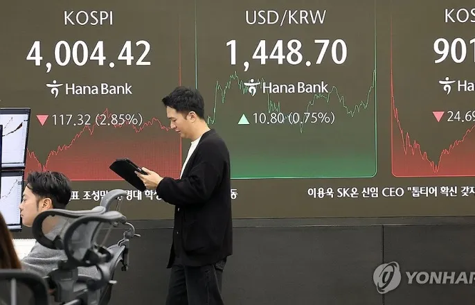 코스피장중3,900선무너지고환율1,450원터치코스피낙폭2.85%로4,000선턱걸이마감(서울=연합뉴스)이동해기자=코스피가급락한5일서울중구하나은행본점딜링룸에서딜러가업무를보고있다.이날코스피지수는전장보다117.32포인트(2.85%)내린4,004.42에,코스닥지수는24.68포인트(2.66%)하락한901.89에장을마감했다[email protected](서울=연합뉴스)민선희기자=5일인공지능(AI)업종고평가우려에위험회피심리가세계적으로확산하면서국내주가지수와원화가치도일제히하락했다.코스피가장중6%넘게밀리면서3,800대까지떨어졌고,원/달러환율도1,450원을터치하며7개월만에가장높은수준으로뛰었다.코스피는이날전장보다117.32포인트(2.85%)내린4,004.42로장을마쳤다.지수는전장보다66.27포인트(1.61%)내린4,055.47로출발해4,000선을내준뒤낙폭을키워오전10시33분께3,867.81까지밀려났다.이후하락폭을축소해서종가기준4,000선은회복했다.이날종가기준코스피하락폭은정부의세제개편안을향한실망감이작용한지난8월1일(126.03포인트)이후3개월만에가장컸다.유가증권시장에서외국인투자자는이틀연속2조원넘게순매도했다.이날외국인은2조5천186억원,기관이790억원을순매도했고개인이물량을받아내며2조5천659억원을순매수했다.코스닥지수는전장보다24.68포인트(2.66%)하락한901.89에장을마치며4거래일만에내림세로돌아섰다.원/달러환율도10원넘게오르며장중1,450원을터치했다.이날서울외환시장에서미달러화대비원화환율의주간거래종가(오후3시30분기준)는전일보다11.5원오른1,449.4원이다.환율은전장보다5.6원높은1,443.5원으로출발한뒤오름폭을키워오후3시28분께1,450원을찍었다.주간거래종가와장중고가모두지난4월11일(종가1,449.9원,고가1,457.2원)이후약7개월만에최고치였다.'검은수요일'코스피,2.85%하락마감(서울=연합뉴스)이동해기자=코스피가급락한5일서울중구하나은행본점딜링룸에서딜러가업무를보고있다.이날코스피지수는전장보다117.32포인트(2.85%)내린4,004.42에,코스닥지수는24.68포인트(2.66%)하락한901.89에장을마감했다[email protected]이날시장전반에위험회피심리가확산하면서국내증시와원화투자심리가위축됐다.뉴욕증시는간밤AI업종과대평가우려에하락했다.다우존스30산업평균지수와스탠더드앤드푸어스(S&P)500지수가각각전장보다0.53%,1.17%씩내렸고,기술주중심의나스닥종합지수는2.04%급락했다.달러강세와위험회피심리고조가맞물리면서원/달러환율이빠르게상승하는것도금융시장불안을키우는요인이다.달러는최근연방준비제도(Fed·연준)의금리경로불확실성고조에강세를나타냈다.주요6개국통화대비달러가치를나타내는달러인덱스는상승세를이어가며100을넘어섰다.이재원신한투자증권연구원은"코스피는미국발AI버블우려를반영하며대형주를중심으로차익실현매물이출회됐다"며"그간코스피상승폭이컸던만큼낙폭도컸다"고설명했다.이유정하나은행연구원은"미국정부일시적업무정지(셧다운)와뉴욕증시부진에위험회피분위기가확산하면서원화가약세인가운데,국내증시에서외국인자금이대규모로유출되면서원화약세압력이심화했다"고분석했다.국제금값과가상자산은하락세다.금현물가격은지난달중순4천300달러를넘어서기도했으나,최근4천달러선아래로밀렸다.최근금가격이급등한데다,세계최대귀금속시장중하나인중국이일부소매업체대상부가가치세환급을종료하면서금투자심리가위축된것으로풀이된다.비트코인도지난6월이후처음10만달러아래로떨어졌다.국내가상자산거래소업비트에서1비트코인가격은전날보다1%가까이내린1억5천만원대에서거래되고있다[email protected]▶제보는카톡okjeboCopyright©연합뉴스.무단전재-재배포,AI학습및활용금지