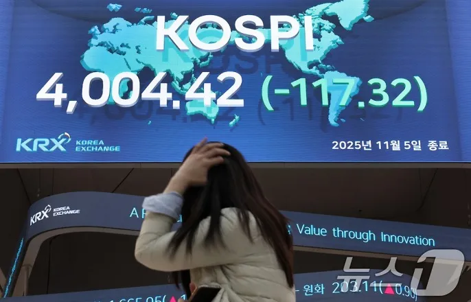 외인이틀간4조7000억매도폭탄“단기에급등…당분간추가조정”국내기업실적개선기대감여전5일오후서울중구하나은행딜링룸에코스피종가등경제지표가표시돼있다.미국에서불거진‘인공지능(AI)거품론’등영향으로이날코스피는직전거래일보다117.32포인트(2.85%)내린4004.42에거래를마쳤다.코스닥도전거래일보다24.68포인트(2.66%)하락한901.89로장을마감했다.원·달러환율은전날보다11.5원오른1449.4원으로주간거래를마무리했다.권현구기자외국인투자자가4~5일던진4조7000억원매도폭탄에코스피가맥을못추고있다.코스피가올해4월연저점대비70%넘게오르면서가격부담이커진상황에서전날미국팔란티어의주가급락으로극대화한‘인공지능(AI)버블’우려가조정의빌미를줬다.시장전문가들은당분간코스피가추가조정을받을수있지만중장기적인상승흐름이훼손된것은아니라고보고있다.기업이익개선과정부의자본시장제도개선등이지속되고있어서다.5일한국거래소에따르면이날외국인은2조5000억원어치코스피주식을내다팔았다.외국인은전날에도2조2000억원어치를내다팔아이례적수준의차익실현에나선상황이다.외국인은9~10월코스피주식을12조원규모순매수하며코스피역대최고치경신의주역이었으나4일부터는그간뿌린씨앗을수확하기바쁜모습이다.이영향에이날코스피는전거래일보다2.85%내린4004.42에마감했다.외국인은최근2거래일코스피상승을이끈주도주SK하이닉스와삼성전자를각각2조7000억원,7500억원순매도했다.또두산에너빌리티(-1830억원)LG씨엔에스(-1800억원)HD현대일렉트릭(-1400억원)등최근급등한종목을대거팔아치우며차익을실현했다.전날뉴욕증시에서AI버블우려가부각되며기술주를중심으로주가가급락한점이외국인투심약화에영향을미쳤다.4일(현지시간)팔란티어는시장기대를뛰어넘는호실적을냈지만주가는7.94%폭락했다.2008년미국금융위기를다룬영화‘빅쇼트’의실제인물로알려진마이클버리가대표적AI기업인엔비디아와팔란티어주가하락에베팅했다는소식이알려지면서AI버블우려를심화시킨것으로분석된다.미국월가거물들을중심으로증시과열에대한언급도이어지고있다.로이터통신등에따르면테드픽모건스탠리최고경영자(CEO)는홍콩통화청이주최한‘글로벌금융리더투자서밋’에서“거시경제충격이아닌자연스러운시장흐름속에서도10~15%정도의조정은언제든발생할수있다”고말했다.같은행사에서데이비드솔로몬골드만삭스CEO역시향후1~2년안에10~20%의주가조정이있을수있다고경고했다.증시낙폭에비하면증권가는침착한분위기다.단기에급등한지수와강세를보이는달러상황을고려하면조정은올수밖에없었다는평가다.정상진한국투자신탁운용주식운용본부장은“언제든지조정을크게받아도이상하지않은상황이었다”며“당분간추가조정가능성이있지만장기대세상승가능성은매우크다”고밝혔다.국내기업의실적개선기대감이여전하고정부의추가상법개정안이이달국회에서구체화할가능성이크다는점을고려하면코스피상승흐름은이어질것이라는전망이다.최근코스피의단기급등에미처주식을사지못했던외국인투자자의신규유입이가능하다는전망도나온다.이에전문가들은주식을급히내던지는‘패닉셀’은지양해야할때라고조언한다.코스피상승의배경인기업이익증가세와정부의자본시장제도개선노력등은훼손되지않았다는이유에서다.이광수장은현기자[email protected]ⓒ국민일보(www.kmib.co.kr),무단전재및수집,재배포및AI학습이용금지Copyright©국민일보.무단전재및재배포금지.