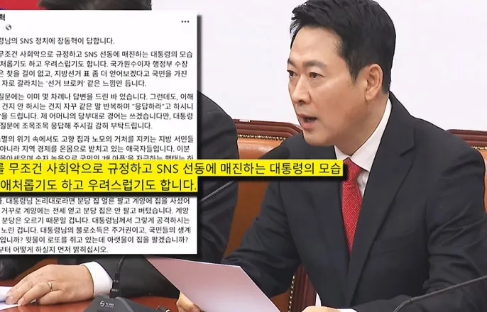 [앵커]설날인오늘,장동혁국민의힘대표가이재명대통령을향해"다주택자를사회악으로선동한다"고목소리를높였습니다.민주당은"설날에도비난의화살만쏜다"며"제1야당대표의매너와품격이없다"고비판했습니다.황예린기자입니다.[기자]장동혁국민의힘대표가이재명대통령을향해"다주택자를사회악으로선동하는모습이애처롭고우려스럽다"고비판했습니다."표얻어보겠다고국민을가진자와못가진자로갈라치는'선거브로커'같다"고도했습니다.다주택자규제메시지를'갈라치기'로규정하며맹공을퍼부은겁니다.[장동혁/국민의힘대표(어제/매일신문유튜브'이동재의뉴스캐비닛'):대통령은저렇게밤낮없이SNS에서융단폭격을하는데새벽에도올리고저한테불만이있으신지또뭐이렇게올리시고이렇게하는데…]전날이대통령이소셜미디어에장대표가주택6채를갖고있다는기사를공유하며다주택자정책에대한의견을묻자,연이어공격하는글을올리고있는겁니다.이대통령은'설마가부동산잡는다'는만평을공유하며부동산정책에대한의지를굽히지않았습니다.민주당도반박에나섰습니다.김현정원내대변인은"설날에도대통령을향한비난의화살만쏘고있다"며"제1야당대표로서매너와품격이없다"고비난했습니다.그러면서"대통령의1주택은퇴임후거주할곳이라고여러차례밝혔다"며"장대표는6채를어떻게할지명확하게밝히라"고꼬집었습니다.장대표가어제올린사진속집에노모가실제살지않는다는주장도나왔지만,국민의힘측은"사실과다르다"고반박했습니다.[영상취재김대호영상편집최다희영상디자인김관후]Copyright©JTBC.무단전재및재배포금지.