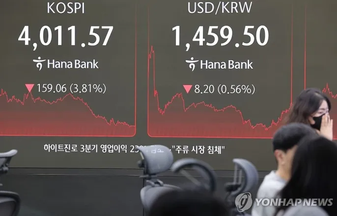 삼성전자·SK하이닉스,각각10만원·60만원선내줘기술주하락·미금리인하기대약화영향…코스닥도하락코스피,뉴욕증시삭풍에3.8%급락마감(서울=연합뉴스)김주형기자=코스피가뉴욕증시급락여파로3%이상하락한14일서울중구하나은행본점딜링룸현황판에코스피지수가표시돼있다.이날코스피지수는159.06포인트(3.81%)내린4,011.57에,코스닥지수는20.47포인트(2.23%)내린897.90에장을마감했다[email protected](서울=연합뉴스)고은지기자=코스피가14일뉴욕증시급락의여파로4,010선까지밀렸다.미국기술주하락,미기준금리기대약화등불안요인이부상하면서외국인이유가증권시장에서2조원넘게순매도했다.이날코스피는전장보다159.06포인트(3.81%)내린4,011.57에거래를마쳤다.지수는전장대비108.72포인트(2.61%)내린4,061.91로시작해오후장들어낙폭을더키웠다.이날오후3시30분기준서울외환시장에서달러대비원화환율은전날보다10.7원내린1,457.0원을나타냈다.유가증권시장에서외국인과기관이각각2조3천574억원,9천3억원을순매도했다.개인은나홀로3조2천337억원을순매수했다.외국인은코스피200선물시장에서도7천551억원매도우위였다.간밤뉴욕증시는3대주가지수가급락세로마감했다.13일(미국동부시간)뉴욕증권거래소(NYSE)에서다우존스30산업평균지수는전장보다797.60포인트(1.65%)하락한47,457.22에거래를마감했다.스탠더드앤드푸어스(S&P)500지수는전장보다113.43포인트(1.66%)밀린6,737.49,나스닥종합지수는536.10포인트(2.29%)떨어진22,870.36에장을마쳤다.미국연방정부셧다운(일시업무정지)해제를선반영한시장이다시인공지능(AI)거품론과미기준금리인하기대약화로시선을돌리며일단투매로대응했다.특히엔비디아(-3.56%),AMD(-4.21%),팰런티어(-6.53%)등AI관련종목의낙폭이컸고,테슬라도6.65%급락했다.코스피·코스닥하락(PG)[김토일제작]일러스트미기술주약세의영향으로삼성전자와SK하이닉스는각각'10만전자'와'60만닉스'를모두내줬다.삼성전자는5.45%하락한9만7천200원,SK하이닉스는8.50%급락한56만원에거래를마쳤다.이외LG에너지솔루션(-4.44%),현대차(-2.15%),두산에너빌리티(-5.66%),KB금융(-3.00%),한화에어로스페이스(-0.10%),기아(-0.85%)등시가총액상위종목대부분이하락했다.HD현대중공업(3.17%)과셀트리온(0.51%)은상승했다.업종별로보면전기·전자(-6.21%),기계·장비(-4.82%),의료·정밀기기(-4.54%),증권(-4.48%)등은내렸고,섬유·의류(0.41%),제약(0.24%)등은올랐다.대신증권이경민연구원은"간밤미국발AI기술주의하락여파로글로벌증시가일제히하락한가운데국내증시는오후장들어전기·전자업종을중심으로외국인의매도세가거셌다"고분석했다.코스닥지수는전장보다20.47포인트(2.23%)내린897.90으로장을끝냈다.지수는전장대비17.95포인트(1.95%)내린900.42로출발해약세를지속했다.코스닥시장에서외국인과기관은각각3천235억원,298억원을순매도했다.개인은3천821억원매수우위였다.알테오젠(0.91%),에이비엘바이오(6.54%),리가켐바이오(4.53%)등제약·바이오주가대체로선방한가운데에코프로비엠(-5.88%),에코프로(-5.07%),레인보우로보틱스(-5.73%)는떨어졌다.이날유가증권시장과코스닥시장의거래대금은각각17조8천853억원,10조5천608억원으로집계됐다.대체거래소넥스트레이드프리마켓과메인마켓의거래대금은총11조995억원이다[email protected]▶제보는카톡okjeboCopyright©연합뉴스.무단전재-재배포,AI학습및활용금지