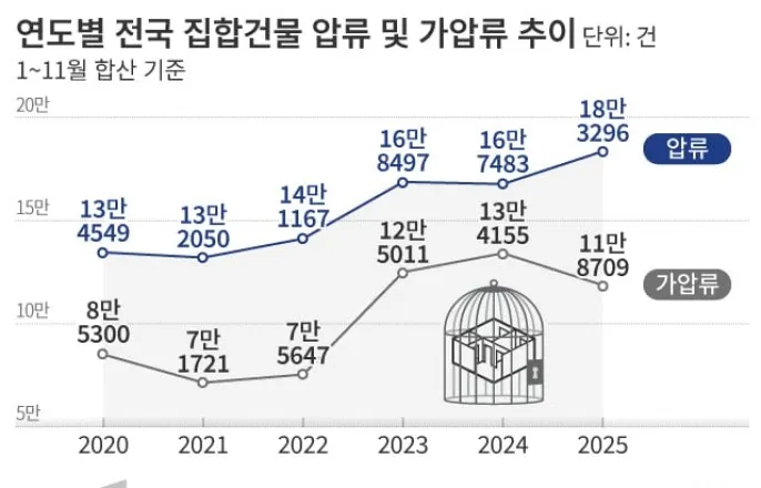 올해1~11월압류등기신청18만3269건“자영업자취약차주늘어…4분의1이연체중”대출못갚은‘영끌족’임의경매도18%↑그래픽=손민균대출금이나전세보증금을제때상환하지않거나세금미납으로압류된주택이5년만에40%가까이급증한것으로나타났다.고금리와경기불황장기화로인해한계상황에처한자영업자,서민층이늘고있다는뜻이다.22일법원등기정보광장에따르면올해1월부터11월까지집합건물(아파트·빌라등)압류등기신청건수는18만3296건으로,전년동기(16만7483건)대비10%증가했다.2020년,2021년13만건수준이었던연간신청건수는올해18만건으로36.2%증가했다.채권자는채무자가돈을갚지않을경우소송을제기할수있는데,승소할경우법원을통한주택등자산압류,강제경매가가능하다.채무자의자산을임시로묶어두는가압류도같은기간증가추세다.2020년8만5300건이었던집합건물가압류등기신청건수는올해11만8709건으로39.2%늘었다.고준석연세대상남경영원교수는“압류된주택은강제경매로넘어가게되는데,이는어려움에처한자영업자등이크게늘었다는것”이라며“경기침체가이어지고있으나대출금리는높은탓에자영업자연체율은계속오름세를기록중”이라고했다.서울중구명동일대에카드대출및대납광고물이붙어있다./뉴스1한국은행이지난9월발표한금융안정상황보고서에따르면올해2분기말기준자영업자취약차주(다중채무자인동시에소득하위30%저소득자)수는43만7000명으로,이중한달이상빚을갚지못한이들의비율은25.6%였다.4분의1이연체중이란뜻인데,연체자비율은2021년1분기(11.3%)대비두배이상으로늘었다.고금리가특히직격탄이됐다.금리가낮아져야이자부담이완화되는데,금리인하속도는더딘상황이다.2020년5월연0.50%였던한국은행기준금리는2023년1월3.5%까지가파르게오른후지난해10월까지1년9개월간역대최장기간동결을유지했다.한은은지난해말부터네차례기준금리를내렸으나,금리인하사이클종료가능성도거론되는상황이다.무리해서집을샀다높아진이자에대출금을제때갚지못한영끌(영혼까지끌어모아주택구입)족도증가했다.올해11월까지전국에서임의경매로인한집합건물소유권이전등기신청은2만2562건으로,전년동기(1만9132건)보다17.9%증가했다.임의경매는채권자가채무자에게담보로제공받은부동산에설정한저당권·근저당권·유치권·질권·전세권·담보가등기등의담보권을실행하는경매다.주로주택등에대한담보대출을받고원리금을상환하지못할경우이뤄진다.-Copyrightⓒ조선비즈&Chosun.com-Copyright©조선비즈.무단전재및재배포금지.
