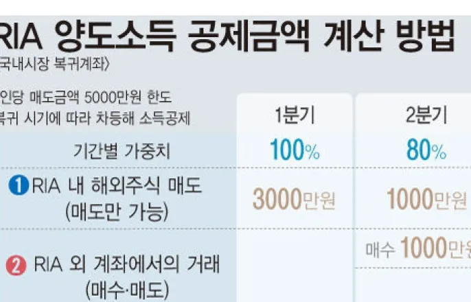 재경부,국내시장복귀계좌양도세혜택복귀시기따라50~100%차등소득공제빨리팔수록이득…일반계좌매수땐혜택↓[서울=뉴시스][세종=뉴시스]임하은기자=#.A씨는올해국내시장복귀계좌(RIA)에서총5000만원의해외주식을팔아국내주식을살계획이다.A씨가낼세금은언제파느냐,어느계좌를썼느냐에따라완전히달라진다.A씨는정부의가중치혜택이큰1분기에3000만원,2분기와10월에각각1000만원씩나눠팔았다.정부의산식에따르면총4300만원을공제받는다.하지만이후A씨가일반주식계좌에서2분기1000만원을매수후11월에팔았다면얘기가달라진다.정부는이를세제혜택만노리고해외주식에재투자하는'체리피킹'으로간주해300만원의페널티를부과한다.결국A씨가받는최종공제금액은4000만원이된다.정부가2월임시국회에서해외로빠져나간투자금을다시끌어들이기위한국내시장복귀계좌(RIA)신설을추진한다.RIA를통해세제혜택을받고일반계좌로해외주식을사면그만큼의순매수금액이공제에서차감되는구조다.20일재정경제부가임시국회에서논의할국내시장복귀계좌(RIA)는쉽게말해'서학개미'로불리는해외투자자들이해외주식을매도할경우,시기별로가중치를차등해세제혜택을주는제도다.올해1분기(1~3월)내매도시매도금액의100%를공제해주지만,2분기는80%,하반기는50%로공제율이줄어든다.기본공제한도는1인당매도금액기준5000만원이다.정부는제도악용을막기위한'체리피킹'차단장치도마련했다.RIA계좌로세제혜택만챙기고,일반계좌에서해외주식을사들인경우엔그순매수금액에비례해공제액을깎는방식이다.[서울=뉴시스]고범준기자=구윤철경제부총리겸재정경제부장관이20일청와대에서열린국무회의에서2026년달라지는민생체감정책자료들고발언하고있다[email protected]예를들어,A씨가RIA의기본공제한도인5000만원을매도한다고가정해볼수있다.그가1분기에3000만원,2분기와10월에각각1000만원씩팔았다면,시점별가중치(100%·80%·50%)가적용돼일단4300만원의공제혜택이산출된다.하지만A씨가같은기간일반주식계좌에서순매수한금액을빼야한다.만약일반주식계좌를통해2분기에1000만원을매수하고,11월에1000만원을팔았다면계산이달라진다.2분기매수가중치적용분(800만원)에서하반기매도가중치적용분(500만원)을뺀‘순매수가중치금액’은300만원이다.결과적으로A씨는RIA계좌에서산출된4300만원공제금에서페널티300만원을뺀총4000만원에대해서만소득공제를받을수있다.이사례는매도금액전액이양도소득금액임을전제로계산했다.RIA에납입한투자금은국내상장주식과국내주식형펀드등에자유롭게투자할수있다.재경부관계자는"이번개정안은의원입법안으로발의돼2월임시국회에서논의될예정"이라며"국내시장복귀계좌등세제지원대상금융상품은관계기관과협조해법안시행시기에맞춰출시할계획"이라고말했다.[서울=뉴시스]황준선기자=서울중구우리은행본점딜링룸에지수가표시돼있다[email protected]☞공감언론뉴시스[email protected]©뉴시스.무단전재및재배포금지.