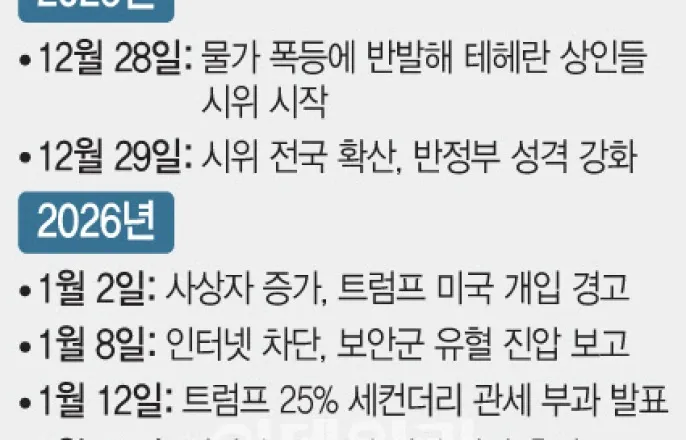이란정부유혈진압에사망자2500명추산트럼프,군사개입시사…핵시설타격가능성도25%세컨더리관세로경제제재강화‘이란의봄’재현가능성…유가도출렁[이데일리임유경기자]이란에서벌어진반정부시위에대한폭력진압으로2500명이상이사망했다는추산이나오고있는가운데,도널드트럼프미국대통령이군사적행동에나설수있음을시사하며이란정부에대한압박수위를높였다.앞서이란과거래하는모든국가에대해25%관세를부과하는방식으로경제제재를강화한것도‘이란의봄’재현을가장우려하는이란정권에치명적인타격을줄수있다는분석이나온다.[그래픽=이데일리문승용기자]13일(현지시간)트럼프대통령은디트로이트방문을마치고워싱턴DC로돌아오는길에앤드루스합동기지에서취재진과만나“사망자규모가상당한것으로보이지만,아직확실히알수는없다”며“숫자가확인되면그에맞게행동하겠다”고말했다.이날자신의소셜미디어(SNS)트루스소셜을통해서는이란당국의유혈진압에대해“큰대가를치르게될것”이라고경고했다.또“나는시위대에대한무분별한살해가중단될때까지이란당국자들과의모든회담을취소했다”며강경기조로전환했음을내비쳤다.같은날CBS방송과인터뷰에서는좀더직접적으로군사개입가능성을시사했다.‘이란정책의최종목표가무엇이냐’는질문에트럼프대통령은“최종목표는승리하는것”이라고답했다.승리의의미를묻자그는자신의1·2기임기동안의기습군사작전을열거했다.최근베네수엘라니콜라스마두로대통령의신병확보를포함해2019년시리아공습으로IS창립자아부바크르알바그다디가사망한작전,2020년이란정예쿠드스군사령관카셈솔레이마니암살등을언급했다.시위자2400명사망추산…백악관“트럼프,모든옵션보유”이란보안군이시위대를향해조준사격하고있다는증언이잇따르는등유혈진압양상이드러나면서,트럼프대통령의발언수위도높아지는모습이다.트럼프대통령은이미시위대에대한무력사용이있을경우군사적으로개입하겠다고거듭경고해왔다.CNN등주요외신에따르면미국에본부를둔인권단체이란인권활동가통신(HRANA)은지난달말시위가시작된이후최소2571명의시위자가사망한것으로추산된다고밝혔다.이단체의스카일러톰슨부국장은“충격적인상황이며,이수치조차도보수적인추정치라고본다”고말했다.통화가치폭락과생활비급등에대한분노에서촉발된이번시위는이란전역31개주,180개도시와마을로확산된것으로전해졌다.이후정치적변화를요구하는움직임으로확대되며지난8일부터급격히격화됐고,당국은인터넷과통신을거의전면차단한상태에서무력을사용해대응하고있다.백악관과이란사태에동원할수있는충분한선택지가있다고강조하고있다.안나켈리백악관대변인은“트럼프대통령은이란에대해활용가능한모든옵션을보유하고있다”고말했다.트럼프대통령은최근미국방부로부터장거리미사일공격,사이버작전,심리전대응등다양한비밀작전및군사적수단에대해보고받았기도했다.미국방부는대통령의어떤결정이든이행할준비가돼있다고강조했다.킹슬리윌슨국방부대변인은성명에서“전쟁부(국방부)는언제어디서든최고사령관의명령을수행할준비가돼있다”고밝혔다.실현가능한군사작전으로는병력·함정·항공기를대규모로집결시키기보다는필요에따라신속히자산을투입하는방안이거론된다.이는지난해6월미본토에서B-2폭격기를출격시켜이란의포르도지하핵시설을타격했을때와같은방식이될것이라는전망이다.“경제제재더치명적”분석다만,미의회내친트럼프진영에서도군사작전에는신중한분위기다.공화당마크웨인멀린상원의원,케빈크레이머상원의원은폴리티코에동맹국과공조한추가제재와경제적압박등‘비군사적수단’을선호한다고밝혔다.지난주공화당의원5명이민주당과함께트럼프대통령의베네수엘라추가군사력사용을제한하는법안처리에찬성하기도했다.경제제재가군사공격보다이란정권이더치명적일수있다는분석도나온다.앞서트럼프대통령은최근이란과거래하는모든국가에대해25%의고율관세를즉각부과하겠다고밝혔다.살인적물가상승에따른경제난이이번시위를촉발한만큼‘세컨더리(2차)관세’로이란정부의‘돈줄’을더조여회복하기어려운타격을주려는조치로풀이된다.‘이란의대전략:정치사’저자인발리나스르존스홉킨스대교수는파이낸셜타임스(FT)기고에서“이란지도부가가장경계하는것은‘아랍의봄’의재현”이라며“리비아와시리아에서는평화시위가무장충돌과내전으로비화해국가붕괴로이어졌다”고짚었다.이어“관세인상전망은중국,인도,이라크,튀르키예,아랍에미리트(UAE)등주요교역국들이이란과의거래를꺼리게만들수있다”며“그에따른경제적고통은추가시위를촉발할가능성이크다”고전망했다.이란정부는미국의경제·군사적압박에반발하고있다.이날주유엔이란대표부는소셜미디어엑스(X·구트위터)를통해“미국의대이란정책과그에따른환상은정권교체에뿌리를두고있다”며“제재와위협,조작된불안과혼란은군사개입명분을만들어내기위한상투적수법으로활용돼왔다”고지적했다.한편지정학적불확실성이높아지고이란산원유공급차질이우