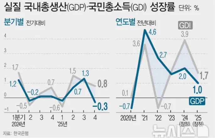 [서울=뉴시스]22일한국은행에따르면지난해우리나라의연간경제성장률은1.0%로집계됐다.지난해4분기성장률은-0.3%를기록했다.(그래픽=전진우기자)[email protected][서울=뉴시스]남주현기자=지난해한국경제가연간1.0%성장에그쳐역대6번째로낮은성적표를받아들었다.반도체수출이AI(인공지능)호황에힘입어버팀목이됐지만미국관세영향에수출증가세가둔화됐고,건설투자도크게부진한영향이다.특히4분기성장률은-0.3%를기록해뒷걸음질쳤다.다만한국은행은3분기급성장에따른기저효과와건설부진이맞물린일시적현상으로진단하며,올해는소비와수출의동반회복을통해성장반등을전망했다.작년성장률1.0%…역대6번째저성장한은이22일발표한'2025년4분기및연간실질국내총생산(GDP)'속보치에따르면,지난해우리나라의연간경제성장률은1.0%로집계됐다.소수점둘째자리로는0.97%다.이는한은전망치(1.0%)에부합하지만전년(2.0%)의절반수준에그친다.역사적으로도외환위기(-4.9%)와2차오일쇼크(-1.5%),코로나(-0.7%),금융위기(0.8%)등에이은역대6번째저성장에불과하다.지난해성장률1%는그나마도반도체에의지해겨우얻어낸성적이다.한은에따르면지난해성장률1.0%중IT제조업기여도는0.6%포인트며,IT제조업을제외한나머지제조업이0.4%에불과하다.건설투자는부동산경기냉각과고공행진중인공사비등으로연간9.9%역성장해외환위기직후인1998년(-13.2%)이후최대감소폭을기록했다.그나마민간소비는정치불확실성해소와민생회복지원금등덕에1.3%성장했다.이동원한은통계2국장은"수출이반도체등을중심으로견조한증가세를이어갔고소비도개선심리개선정책효과등의영향으로회복흐름을보였지만,건설투자가제약했다"면서"건설투자가중립적이었다면지난해성장률은2.4%가됐을것"이라고했다.이어"재작년2분기부터우리경제성장세가미약했고지난해1분기에는정치적불확실성에역성장이나타나기도했지만,이후에는예상보다빨리회복되는흐름을보여왔다"면서"4분기마이너스성장에도연간성장률1.0%는큰의의가있다"고덧붙였다.22일오전서울중구한국은행에서열린2025년4/4분기및연간실질국내총생산(속보)기자설명회.사진왼쪽부터이현영지출국민소득팀장,이동원경제통계2국장,박창현국민소득총괄팀장,이예지국민소득총괄팀과장(사진제공=한국은행)*재판매및DB금지작년4분기0.3%'깜짝'역성장…한은"기조적성장세"4분기성장률은전기대비0.3%역성장해전망치(0.2%)를크게밑돌았다.소수점둘째자리로는-0.28%다.한은은3분기깜짝성장에따른기저효과가크게작용했다고봤다.여기에건설투자가당초기대와달리4분기에만3.9%감소한점도결정적이다.수출(-2.1%)도마이너스로돌아섰다.다만이국장은"반도체수출은좋았지만상당부분가격상승에의한효과로4분기에는물량이크게늘지는않았다"면서"현재는공급능력이수요를뒷받침하지못하는상황"이라고설명했다.민간소비증가율(0.3%)은전분기(1.3%)보다낮아지만성장세를이어갔다.이국장은"4분기에는정책효과가많이줄어든상황에서도플러스성장을했다"면서"소비가꺾이지않았다는면이올해를긍정적으로보게하는측면이있다"고언급했다.이국장은또"3분기1.3%성장은연율로5.4%로엄청난숫자로4분기성장률이상당히낮아질것이란점은예상된상황"이라면서"다만기저효과에더해건설투자회복속도가기대에못미친점이성장률을낮추는요인으로작용했다"고말했다.한은,올해성장률반등기대한은은올해성장률은지난해보다확대될것으로보고있다.한은은지난해11월경제전망을통해올해성장률로1.8%로예상한바있다.이후이창용한은총재는1월금융통화정책회의기자회견에서성장상향조정을시사했다.IMF의올해전망치는1.9%다.이국장은"민간소비와재화수출모두지난해에이어서증가를이어갈것으로본다"면서"또한올해정부예산이작년대비3.4%늘었는데이런영향이정부지출기여도가높아질것으로예상된다"고말했다.이어"지난해이례적으로성장을크게제약했던건설의제약정도도올해연간으로는상당폭줄어들것으로보고있다"며"특히지난해1.4%를까먹은건설투자가중립적인수준으로돌아온다면성장률을더높일수있는요인으로작용할것"이라고언급했다.한편재정경제부는올해4분기마이너스성장에대해"15분기만에최대폭으로성장했던3분기기저효과와10월추석장기연휴등으로조정됐으나,전년동기비로는1%대중반(1.5%)성장해기조적회복흐름이지속되고있다"고평가했다.연간성장률1%를기록한것에대해서는경기회복흐름을반영,상향조정된정부전망(1.0%)과시장전망에부합한다고평가했다.김재훈경제정책국장은"올해는2%내외로성장할것"이라면서"작년하반기이후회복흐름은올해도지속될것"이라고했다.☞공감언론뉴시스[email protected]©뉴시스.무단전재및재배포금지.