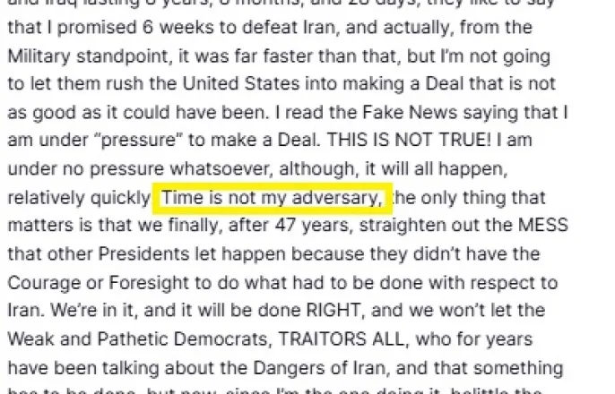 트럼프,트루스소셜통해민주당및반대세력비난이란협상에서"압박없다"며"서두르지않겠다"강조21일부터협상시작,美동부시간22일저녁까지대화미국의도널드트럼프대통령이18일(현지시간)미국워싱턴DC백악관에서기자들의질문을듣고있다.AP연합뉴스[파이낸셜뉴스]이란과휴전기한을사실상하루더연장한미국도널드트럼프대통령이이란과협상에서어떠한압박도받지않는다고밝혔다.그는시간에쫓겨나쁜합의를하지않겠다고강조했다.트럼프는20일(현지시간)소셜미디어트루스소셜에글을올려이란과협상에대해언급했다.그는"모든일이비교적신속하게진행될것이지만시간은나의적이아니다"라고주장했다.트럼프는"내가합의를도출해야한다는'압박'을받고있다는가짜뉴스를읽었는데이는전혀사실이아니다"고적었다.이어"중요한것은다른대통령들이이란과관련해서해야할일을하지못해발생하게된그혼란을마침내47년만에바로잡는것"이라고밝혔다.트럼프는"우리는이일을하고있으며,그것은올바르게이어질것"이라고강조했다.그는"내가이를하고있다는이유로군과트럼프정부의성과를깎아내리는나약하고한심한민주당,배신자들을가만두지않겠다"고지적했다.트럼프는"민주당은우리가이란과관련해매우강력한입지에있다는것을훼손하기위해모든수단을동원하고있다"라고비판했다.그는"제1차세계대전이4년3개월14일지속됐고,제2차세계대전이6년1일지속됐으며,한국전쟁이3년1개월2일,베트남전이19년5개월29일,이라크전쟁이8년8개월28일지속됐음에도불구하고,그들은내가이란을6주만에격파하겠다고약속했다고떠들어대기를좋아한다"라고강조했다.트럼프는"군사적관점에서보면그것은그(6주)보다훨씬빨랐다"면서"그러나나는미국의최선의협상보다못한합의를하도록서두르지않을것"이라고강조했다.아울러그는이란내군사작전에대해"베네수엘라사태때와마찬가지로완벽하게수행되고있다"며"단지그규모가더크고복잡할뿐이며,같은결과가나올것"이라고주장했다.앞서트럼프는지난7일트루스소셜에"나는이란정부가호르무즈해협을완전하고즉각,안전하게개방하는조건으로2주일동안이란에대한폭격과공격을중단하는데동의한다"고적었다.이에대부분의외신들은휴전이21일까지지속된다고보도했다.트럼프는20일미국PBS방송과전화인터뷰에서"휴전이만약21일저녁에끝나면어떻게되느냐?"는질문에"많은폭탄들이터지게될것"이라고답했다.그러나트럼프는이후20일다른매체와인터뷰에서휴전종료시점에대해"워싱턴시간으로수요일(22일)저녁"이라고말했다.그는파키스탄에서21일부터이란과2차종전협상이시작된다며휴전기간이추가연장될가능성은"매우작다"고주장했다[email protected]박종원기자Copyright©파이낸셜뉴스.무단전재및재배포금지.