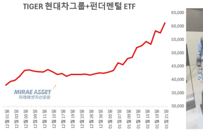 미래에셋자산운용의‘TIGER현대차그룹+펀더멘털’ETF추이(왼쪽)와미국보스턴다이내믹스(BD)가공개한휴머노이드로봇‘아틀라스’(오른쪽).그래픽=임성영기자현대차가15%안팎의급등세를보이며조정국면에접어든국내증시의하방을지탱했다.시장에서는현대차그룹이완성차제조업체를넘어‘피지컬인공지능(AI)’기업으로전환국면에들어서면서본격적인주가재평가(리레이팅)에들어갔다는분석이나온다.다만단기간에주가가급등하면서신규투자자입장에서는개별종목에대한접근부담도커진모습이다.이에단일종목대신여러종목에분산투자하는ETF가대안으로주목받고있다.21일한국거래소(KRX)에따르면‘TIGER현대차그룹+펀더멘털’는연초이후약44%상승률을기록중이다.같은기간코스피가16.5%오른것과비교하면약세배에가까운성과다.현대차,피지컬AI전환에주가리레이팅본격화지난CES2026을기점으로현대차그룹을바라보는시장의시각은‘제조업’에서‘피지컬AI’기업으로바뀌고있다.현대차그룹이지분투자한미국보스턴다이내믹스(BD)가공개한휴머노이드로봇‘아틀라스’를통해로보틱스전략이기술시연을넘어실제사업모델로확장되고있다는인식이확산된영향이다.특히현대차그룹은소재(현대제철)부터핵심부품(현대모비스),로봇기술개발(보스턴다이내믹스),양산및소프트웨어(현대차·오토에버),물류관제(현대글로비스)에이르는‘피지컬AI밸류체인’을두루갖춘점에서더높은평가를받는다.현대차는로봇을양산해공장과산업현장에투입하고,현대글로비스와현대오토에버는각각물류와소프트웨어·관제영역을담당하는구조로,향후로봇상용화시경쟁사들이쉽게따라오기어려운진입장벽이될수있다는분석이다.증권가에서는현대차가보스턴다이내믹스를통해혁신의전환점에섰다고평가하며성장기대를키우고있다.보스턴다이내믹스지분가치까지더하면현재주가가여전히저평가구간이라는판단속에목표주가상향이잇따르고있다.KB증권은이날현대차목표주가를종전31만원에서80만원으로158%상향조정했다.강성진연구원은“보스턴다이내믹스가현대차생산성혁신의결정적전환점이될것”이라며“보스턴다이내믹스간접지분가치와기존자동차사업,휴머노이드를활용한자율주행파운드리비즈니스확장가치등을합산한결과”라고설명했다.유지웅다올투자증권연구원도“3년내휴머노이드로봇을공장에투입할수있는완성차기업은테슬라와현대차뿐”이라며목표주가를기존47만원에서64만원으로올렸다.NH투자증권역시“완성차업체에서피지컬AI선두주자로전환되면서밸류에이션산정방법을변경했다”며현대차목표주가를48만원에서60만원으로상향조정했다.현대차+조·방·원담은‘TIGER현대차그룹+펀더멘털’ETF관심이같은전망속에시장에서는관련ETF로도투자수요가확산되고있다.현대차그룹의성장모멘텀은누리면서도개별종목대비변동성을낮추려는투자자들이늘어난영향이다.대표적인상품으로는미래에셋자산운용의‘TIGER현대차그룹+펀더멘털’ETF가꼽힌다.해당ETF는현대차·기아·현대모비스등현대차그룹핵심계열사에집중투자하는동시에조선·방산·원자력·전력기기등이른바‘조·방·원·전’테마종목도함께담고있다.HD한국조선해양·HD현대중공업(조선),현대로템(방산),현대건설·HD현대일렉트릭(원전·전력기기)등이편입돼있어현대차그룹리레이팅과조·방·원·전메가트렌드를동시에추종할수있는구조다.정의현미래에셋자산운용ETF운용본부장은“개별종목의단기변동성보다현대차그룹전체의구조적성장흐름에투자한결과성과가나타나고있다”며“단일종목이나개별테마로는포착하기어려운변화를효율적으로반영할수있어현대차그룹리레이팅국면에대응하는전략적투자수단으로부각되고있다”고말했다.임성영기자[email protected]©쿠키뉴스.무단전재및재배포금지.