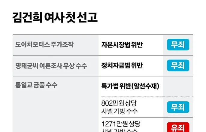 [김건희알선수재혐의등1심선고]3개혐의중2개무죄...징역1년8개월선고①도이치모터스:시세조종인식했지만공범은아냐②명태균여론조사:윤석열부부지시·관여증거없어③통일교알선수재:22년7월샤넬백·목걸이만유죄김건희여사가8월6일서울종로구광화문민중기특별검사팀사무실에조사를받기위해출석하고있다.강예진기자“의심이든다.”김건희여사의자본시장법위반혐의등을심리한1심재판부가김여사의혐의대부분을무죄로판단하면서'의심이든다'는표현을판결문에총6번남긴것으로확인됐다.도이치모터스주가조작혐의부분에5번,명태균여론조사의혹에1번이다.재판부는"범죄가의심의여지없이충분히증명되지않았다"는이유로두혐의모두를'무죄'판결했다.서울중앙지법형사합의27부(부장우인성)는김여사의1심판결문에김여사에게징역1년8개월,추징금1,281만5,000원을선고하게된근거를상세히밝혔다.판결문은123쪽분량이다.그래픽=김대훈기자도이치공범,김건희에"싸가지,쌍X..."재판부는김여사의도이치모터스주가조작(자본시장법위반)혐의와관련해주가조작을인지했을것으로보이지만,법리상공동정범이성립하기위한'분업적역할분담'은없었다고결론내렸다.재판부는이같은판단에앞서시세조종행위를①2010년10월22일부터2011년1월13일까지김여사의대신증권계좌주식18만주및미래에셋대우계좌의20억원이시세조종에이용된것②2011년3월30일한화투자증권계좌로도이치모터스주식2만3,000주를매수한것③2012년7월25일부터2012년8월9일까지도이치모터스주식1만9,635주를한화투자증권계좌로매수한것으로분류했다.이어①번행위에대해"미필적으로나마자신의계좌와주식이시세조종에이용됐을수있다는인식은있어보이지만,가담했다고보긴어렵다"고했고,"방조에해당한다고하더라도공소시효가완성됐다"고보인다고판단했다.②와③은김여사가독자적판단으로주식을매수했다고봤다.판단근거로는당시주가조작선수들의대화를들었다.이들이주고받은문자등을볼때시세조종'공범'으로판단하기는어렵다는것이다.도이치모터스주가조작'선수'민모씨와김모씨가2011년4월주고받은문자메시지가대표적이다.민씨가김씨에게"매수대기조는대기만시켜놔요?"라고묻자,김씨는"피아가분명한팀은이제조금씩사야지ㅎㅎ김건희,김**(다른투자자)같은싸가지시스터스같은선수들말고"라고답했다.민씨는2011년1월에도"대판했대요.왜할인해서넘겨줬냐고…(중략)…권사장도엄청흥분하고,김(건희)은그앞에서대우지점장한테전화해서이런법이있냐고하고"라고보냈고,김씨는"X년이구먼듣던대로"라고답했다.도이치모터스거래수익정산을앞두고김여사가항의하는것을두고나눈대화인데,재판부는이같은정황을볼때이들주가조작세력이김여사를공모관계에있는내부자가아니라,외부자(거래상대방)로취급했다고판단했다.윤석열“김영선이그거해주라그래”라고했지만…윤석열대통령부부공천개입의혹의핵심인물인명태균(왼쪽)씨와김영선전국민의힘의원이2024년11월14일공천을대가로정치자금을주고받은혐의(정치자금법위반)로경남창원시성산구창원지방법원에서열린구속전피의자심문(영장실질심사)에각각출석하고있다.뉴스1재판부는명태균의혹과관련해'김영선국민의힘의원의공천'은무상여론조사제공의대가라고볼수없다고판단했다.재판부는"명씨가피고인부부에게김영선의국회의원선거공천을수차부탁한점등을고려하면,명씨가무상으로여론조사결과를피고인부부에게제공하고그대가로피고인부부가영향력을행사하여김영선이국회의원선거공천을받은것은아닌가'의심은간다'"면서도"단정하기어렵다"고적시했다.재판부는또한"당시윤석열전대통령이'공관위에서나한테들고왔길래내가김영선이경선때부터열심히뛰었으니까그거는김영선이를좀해줘라그랬는데말이많네당에서'라는말을했으나,실제공천관리위원회에서그러한말이고려된바는없는것으로보인다"고짚었다.당시국민의힘공관위회의록에따르면,윤전대통령발언과무관한이유로김전의원이표가압도적으로많았다는게그근거다.재판부는더불어김여사가공범으로서한행위가전혀입증되지않았다고봤다.재판부는"김여사는정치활동을하는자로볼수없고,'경제공동체'논리를전제한다하더라도김여사가이여론조사결과라는이익수수에있어어떠한역할을했는지기록상파악되지않는다"고했다.연관기사•체면구긴특검...도이치·명태균의혹'무죄',15년구형이1년8개월선고로(www.hankookilbo.com/news/article/A2026012818020003250)•김건희'통일교금품수수'유죄,징역1년8개월..."영부인지위오용,자신치장에급급"(www.hankookilbo.com/news/article/A2026012815350000008)•김건희"재판부지적겸허히수용…심려끼쳐드려송구"(www.hankookilbo.com/news/article/A2026012817290003797)•김건희'징역1년8개월'선고...헌정사첫전대통령부부실형(www.hankookilbo.com/news/article/A2026012809070001830)조소진기자[email protected]장수현기자[email protected]이서현기자[email protected]©한국일보.무단전재및재배포금지.