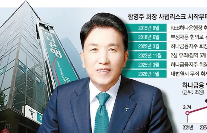 대법,업무방해혐의무죄취지파기환송⋯8년만에사법족쇄풀어“안정적인지배구조하에금융본연역할”⋯정부정책기조발맞춰순이익‘4조원클럽’입성전망⋯스테이블코인등핵심사업총력함영주하나금융지주회장이부정채용혐의에대해대법원에서무죄를확정받으면서8년간안고있던‘사법리스크’를떨쳐냈다.경영전반을짓눌렀던불확실성이해소된만큼,생산적금융전환등하나금융의주력사업과미래전략에속도가붙을전망이다.하나금융은29일입장문을통해“대법원의공명정대한판결에무한한존경과감사를표한다”며“판결을계기로안정적인지배구조속에서더낮은자세와겸손한마음으로어렵고힘든금융소외계층을세심하게살피겠다”고밝혔다.이어“국가미래성장과민생안정지원을위한생산적금융공급및포용금융확대에그룹의모든역량을집중하겠다”며“지속가능한이익창출을통해기업가치와주주환원을더욱증대하며금융본연의역할을충실히이행하겠다”고강조했다.대법원1부(주심서경환대법관)는이날업무방해,남녀고용평등법위반혐의로기소된함회장에게유죄를선고한원심판결중업무방해부분을무죄취지로파기환송했다.남녀고용평등법위반혐의에대해서는유죄가확정됐지만,벌금형이라회장직유지에는문제가없다.금융사지배구조법상금고이상의실형이나집행유예가확정된경우에만금융사임원취임이제한된다.업무방해혐의에관한판단은파기환송심에서다뤄질예정인데,무죄가선고되거나형량이줄어들가능성이크다.사실상함회장은남은임기(2028년3월)를채울수있게된것이다.앞서함회장은해외금리연계파생결합펀드(DLF)관련소송에서최종승소하며사법적부담을한차례덜어낸바있다.이번대법판단으로경영현안에만매진할수있는환경이조성된만큼,강력한리더십을발휘할것이란전망이나온다.사법리스크를안고있던함회장이지난해3월연임할수있었던것도경영실적과검증된리더십덕분이라는평가가지배적이다.하나금융에따르면2015년하나은행과외환은행통합이후함회장이초대은행장을맡은뒤2024년말까지그룹주가는228%상승했다.총자산은2016년약437조원에서지난해3분기기준약857조원으로두배가까이증가했고,같은기간당기순이익은1조원수준에서3조4000억원대로확대됐다.30일발표될지난해실적에서하나금융은사상최대순이익을기록하며처음‘4조원클럽’에입성할것으로예상된다.전년대비8~9%대증가한수준이다.함회장은견고한실적을토대로이재명정부정책기조에발맞출것으로보인다.하나금융은2030년까지5년간84조원규모의생산적금융,민생경제안정을위한16조원규모의포용금융에나선다는계획이다.지원을넘어실질적인투자로실물경제활성화에앞장선다는취지다.특히스테이블코인사업등디지털금융시장선점에힘을쏟을계획이다.하나금융은원화코인발행·유통시장선점을목표로관련컨소시엄구축을그룹핵심사업으로추진중이다.최근BNK금융지주,iM금융지주,SC제일은행,OK저축은행등과원화스테이블코인발행을위한컨소시엄구축업무협약을맺기도했다.하나금융관계자는"함회장의무죄확정으로남은임기2년간리스크없이다양한전략추진동력이안정화될것으로기대된다"고말했다.