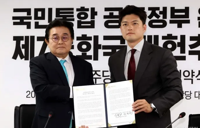 [the300][서울=뉴시스]김용태국민의힘비상대책위원장과전병헌(왼쪽)새미래민주당상임선대위원장이28일오전서울여의도새미래민주당중앙당대회의실에서열린국민통합공동정부운영과제7공화국개헌추진협약식에서기념촬영을하고있다.2025.05.28.국민의힘과새미래민주당이제7공화국개헌추진을위해정식으로손을맞잡았다.이낙연새미래민주당상임고문(전국무총리)이김문수국민의힘대선후보지지를선언한지하루만이다.양당은국민통합공동정부를구성·운영하고대통령임기시작이후2년내국민투표를통해개헌을완료하겠다고밝혔다.김용태국민의힘비상대책위원장과전병헌새미래민주당대표는28일오전서울여의도새미래민주당당사에서'국민의힘-새미래민주당국민통합공동정부운영과제7공화국개헌추진협약식'을열었다.양당은협약서를통해"제21대대선은대한민국이정치적내전으로무너지느냐,통합과성장의제7공화국이되느냐를결정하는중대한선거"라며"윤석열전대통령과이재명후보의동반청산이시대정신"이라고했다.그러면서"조기대선을전리품으로챙긴더불어민주당이재명대통령후보는벌써부터국가권력을사유화하려는입법폭주를시작했다"며"이낙연전총리가예견한괴물독재국가가현실화되고있는것"이라고했다.두사람은"국민의힘과새미래민주당은삼권분립과민주주의를파괴하는이재명독재정권탄생을저지하는것이가장중대한국가적과제라는데에인식을같이하고연대하기로했다"고했다.양당은연대의실천을위해△공동정부구성및운영△제7공화국출범을위한개헌추진△3년내대통령임기종료△대선과총선동시실시등을진행하겠다고했다.구체적으로양당은국민통합공동정부를구성·운영하고이를위해양당대표가임명하는실무협의체를통해대선승리를위해공조하기로했다.대통령임기개시부터개헌추진위원회를정부기구로설치·운영하고2년안에국민투표를통해개헌을완료한다는계획이다.3년내대통령임기를마치고제7공화국체제를시작하며개헌추진위원회는4년중임대통령제를중심으로대통령불소추특권폐지를비롯한정치개혁공약을신속하게실천한다.양당은중단된남북협력과교류를재개하기위해최대한빠른시일안에정상회담을추진한다는데에도의견을모았다.이와함께한미동맹을기본으로북한동포의자유와인권신장을위해국제사회와협력할예정이다.지역과청년문제도우선적으로해결하겠다고했다.특히지역소멸이진행되고있는인구30만명이하중소도시청년에게청년특권을부여해청년들의창의적인활동을지원하는정책을운영한다.기후위기와불평등등인류가직면한문제에대해서도ESG(환경·사회·지배구조)사회로의정의로운전환을통해근본적인해결책을마련하기로했다.[서울=뉴시스]조성봉기자=김용태국민의힘비상대책위원장과전병헌(오른쪽)새미래민주당상임선대위원장이28일오전서울여의도새미래민주당중앙당대회의실에서열린국민통합공동정부운영과제7공화국개헌추진협약식에서대화를하고있다[email protected]/사진=조성봉김위원장은협약식모두발언에서"이낙연상임고문이이재명후보가집권하면대한민국은괴물독재국가가될것이라고말했다"며"전적으로동의한다.지금민주당은더이상민주정당이아니다.이재명을아버지라부르는사람이활개치고비명횡사가공공연하게이뤄지는이재명사당으로바뀌었다"고했다.이어"이재명이집권하면행정부와사법부마저지금민주당꼴이날것이다.삼권분립,민주주의가붕괴하고이재명에의한,이재명을위한나라가될것"이라며"80년대김영삼,김대중두분처럼국민의힘과새미래민주당은민주주의를지키고괴물독재국가출현을막겠다"고했다.전대표는"입법과행정,사법3권을모두장악하는괴물독재의길에새미래민주당은결코함께할수없다"며"이준석개혁신당대선후보에게도호소한다.'윤석열-이재명동시청산'이라는시대정신으로이재명괴물독재정권의등장을함께막아내는대열에참여할것부탁한다"고했다.한편전대표는전날김후보지지를선언한이낙연새미래민주당상임고문이TV찬조연설에나선다고예고했다.전대표는"국민께이낙연-김문수연대의불가피성,이낙연이보는김문수에대해,괴물독재국가출현의위험성에대해간곡히호소할예정"이라며"이미오전에녹화가끝났다"고했다.김위원장은이상임고문을향해비판을쏟아낸민주당을향해"민주당스스로지금민주당후보가부끄럽기때문에오늘새미래민주당과협약식에크게반응한다고생각한다"고답했다.또이상임고문과합동유세여부에대해서는"선거운동방식은법에저촉되지않는범위내에서저희가가능한범위를확인후에공개하겠다"고말했다.박상곤기자[email protected]©머니투데이&mt.co.kr.무단전재및재배포,AI학습이용금지
