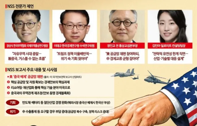美,최고위전략문서에'중국위협'인식우방중심으로중국배제무역질서재편자국우선주의정책병행은산업계부담"산업·기술별세부대응전략설계해야"미국안보전략의또다른축은'경제안보'다.중국을배제하는무역질서재편을핵심의제로내세우며한국의부담을키울거란분석이나온다.미국이무역관계리밸런싱과관세를통한재산업화를내걸고중국을견제하기위한동맹들의정책변화를요구하고있기때문이다.미·중갈등의여파가한국에전가되지않도록산업·기술공급망구조를구분해대응해야한다는지적이제기된다.도널드트럼프행정부가최근공개한미행정부최고위전략문서인국가안보전략(NSS)보고서에따르면미국은중국을단순경쟁국이아닌'글로벌무역질서를왜곡하는구조적위험'으로규정했다.이와함께무역적자축소,핵심공급망외부의존차단등을패키지로묶었다.'무역관계재조정'을경제안보핵심과제로제시했다는점에서기존의전략문서보다강경해졌다는평가다.'무역재조정'앞세운美,우방의中견제요구미행정부는보고서에"무역관계재조정을우선하며무역적자를축소하고덤핑·불공정관행을종식하겠다"며"핵심광물·핵심자재·부품및완제품까지공급망을의존하지않기위해약탈적경제관행을견제하겠다"고밝혔다.이를위해리쇼어링(Reshoring)을추진하고관세·신기술등을활용한재산업화를병행한다는방침이다.특정산업이언급되진않았으나반도체·배터리등첨단산업이핵심공급망으로분류되는만큼한국산업계에영향이직결될것으로보인다.NSS보고서는미국·동맹간공급망협력확대를전제로,중국에대한무역리밸런싱을요구하고있다.중국과의교역을줄이고미국·동맹중심공급망으로재편하란메시지다.'중국에해온만큼미국에도투자하라'는압박으로도해석할수있다.이같은전략을뒷받침하기위해'경제블록화'구상까지제시했다.보고서는미국의경제규모가30조달러,우방국의경제력이35조달러에달한다며이를합산하면세계경제의절반에이른다고언급했다."한국·일본·유럽·호주·캐나다·멕시코등이'연합경제력'으로중국을견제해야한다"는것이다.표면적으로는"동맹국경제가어떤경쟁세력에도종속되지않도록하겠다"는명분을제시했지만"(한국등이)중국경제를'내수중심'으로재조정하는데도움이되는무역정책을채택하도록해야한다"는게핵심이다.사실상미국의설계대로공급망구조를바꾸라는명시적압박으로풀이된다.이는중국의'근린궁핍화'에기인한것으로분석된다.의도와무관하게중국산업계를부흥하기위한보조금등정책이이웃국가의산업을희생시키고있다는것이다.한국은반도체·배터리·전장등중국의미국진출이구조적으로제한된산업에서상승효과를기대할수있다.미국과정책보조를맞춰야하는유럽등시장에서도한국산이대안으로꼽힌다.장상식한국무역협회국제무역통상연구원장은"과거에는중국이성장할때세계경제가함께성장했지만이젠전세계에마이너스영향을미친다"며"더구나희토류등공급망을갖고있어미국의위기감이더크다"고진단했다.이어"한국과중국도보완관계에서경쟁관계로바뀐만큼대중수출감소보다다른시장에서경쟁이완화되는효과에주목한다"고했다.반사이익기대속미국우선주의부담커진다도널드트럼프미국대통령과시진핑중국국가주석이지난10월부산김해공군기지의전실나래마루에서미·중정상회담을마친뒤회담장을나서며대화하고있다.연합뉴스하지만중국산배제에따른시장공백이곧바로한국기업들의수출확대로이어지긴어려워보인다.현지투자·공급망투명성확보등추가적인정책요구가뒤따를수있어서다.미국의대중견제아래깔린자국우선주의정책이기업부담을키울거란지적이나오는이유다.이태규한국경제연구원수석연구위원은"미국이중국에대한디커플링을요구하면서지금과같은관세정책을펼치는건이율배반적인태도"라고질타했다.그는"중국은이미전세계시장에공급망을갖췄고미국마저도완전한탈중국이어렵다"며"동맹들이똘똘뭉쳐도중국의부상을막기어려운만큼대중의존도를낮출수있도록지원책이선행돼야한다"고했다.무엇보다미국의이중성이공급망안정논리와도충돌한다고봤다.이위원은"과거에는가격·품질·효율로경쟁했다면지금은공급망복수구축과정책리스크까지고려해야하는고차방정식이됐다"며"한국기업들은미국의방침으로부담이커질수밖에없다"고우려했다.미국은최근'팍스실리카'서밋을열고AI·반도체공급망에서중국을견제하는경제동맹을출범했다.한국·일본·싱가포르·네덜란드·영국·이스라엘·아랍에미리트(UAE)·호주등8개국이핵심광물·에너지·반도체·AI기반시설등측면에서공동대응하기로했다.정부로선중국에대한수출통제등을요구할경우부담이커질수있어조심스러운분위기다.좁아지는선택지…"산업·기술별대응정교화"미국의대중견제구상이본격화할수록한국의선택지는좁아지고정교해질수밖에없다는분석이나온다.동맹으로서'경제블록'참여를요구받는동시에미국우선주의부담까지떠안는구조에서산업별이해관계를고려한세밀한대응이필요하다는것이다.같은맥락에서중국과의교류를단절하기어려운현실을감안해균형점을찾는게우선과제로꼽힌다.정인교전통상교섭본부장은"