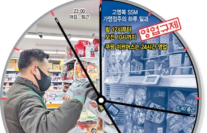 [새벽배송규제의민낯]③기업형슈퍼마켓(SSM)점주의비명오전7시문열어도10시전판매불가출근전오는손님도그냥돌려보내매출직격탄...정직원10명→2명으로"골목상권살리겠다고만든법골목상권다죽이는악법으로"[이데일리한전진기자]14년간개인슈퍼를운영하다지난해1월기업형슈퍼마켓(SSM)GS더프레시가맹점으로전환한고명복점주는하루16시간을매장에서보낸다.오전6시40분출근해밤11시마감까지,진열·배달·발주·결제등대부분업무를도맡아하고있다.264㎡(80평)남짓매장에예전엔정직원10명을뒀지만,지금은정직원2명,아르바이트3명이다.고점주는“사람을쓰면좋은데매출이계속줄어어쩔수없다”며“월세를깎을수도없어줄일수있는건인건비뿐”이라고토로했다.[이데일리이미나기자]“진열은7시,판매는10시부터…3시간공치는법”한때그는서울강서·양천구일대에서개인슈퍼4개를운영했지만쿠팡배송이본격화하면서하나씩줄었다.직접가락시장에서물건을떼와도가격경쟁이안됐다.고점주는“쿠팡가격이우리가떼오는값보다훨씬저렴했다”며“혼자고군분투해선답이없었다”고했다.결국기업물류와브랜드힘을빌리기로했다.대신따라온건유통산업발전법규제였다.야간·아침영업제한(자정~오전10시),월2회의무휴업.GS간판을달았다는이유로대형마트와같은족쇄가채워졌다.고점주는매일오전7시면매장불을켠다.새벽에도착한물건을진열해야해서다.문제는규제탓에손님이9시50분에와도팔수없다는점이다.오전10시전에는매장의POS(판매관리)시스템이작동하지않는다.고점주는“출근전반찬이나애들간식사러오는분들이많은데그냥돌려보내야한다”고했다.개인슈퍼시절단골들은적응하지못했다.예전엔됐는데왜안되냐는항의도있었다.고점주는“간판만바뀐것인데전에없던규제만생긴것”이라고토로했다.그가계산한손실은구체적이다.오전10시이전영업만자유롭게풀려도하루100만~150만원매출이가능하다.한달로환산하면약3000만원에달한다.어차피물건진열을위해매장문을열어야하는시간이다.여기에월2회의무휴업으로생기는매출공백까지합치면월매출손실규모는5000만원이넘는것으로추산된다.고점주는“의무휴업은단순매출손실뿐아니라식품폐기비용증가등에도영향을준다”며“연손익을따지면정직원두명의인건비”라고했다.이어“지금은혼자시간을갈아넣어버티는데몇년더이러면몸이안될것”이라고덧붙였다.서울시내쿠팡배송차량모습.(사진=연합뉴스)“80평슈퍼묶고,쿠팡41조풀어줘…이것이법”유통산업발전법상규제는2012년전통시장보호를명분으로도입됐다.대형마트가쉬면소비가전통시장으로이동할것이라는논리였다.현실은정반대로흘렀다.대형마트·전통시장모두발길이줄어드는사이,규제대상에서빠진쿠팡은2018년4조원대였던연매출을2024년41조원까지키웠다.법이보호하려던골목상권은쪼그라들고,규제의빈틈에있던이커머스만커진셈이다.고점주는“골목상권살리겠다고만든법인데골목상권은이미다죽었다”며“80평남짓한우리가아침장사를안한다고과연시장이좋아지겠는가”라고했다.고명복점주가현유통산업발전법상규제의문제점에대해설명하고있다.(사진=한전진기자)고점주는“SSM가맹점도사실상소상공인인데규제는대기업으로묶인다”며“결국쿠팡,식자재마트등규제를받지않는쪽만커지는구조”라고했다.실제식자재마트는규모가커도유통산업발전법상규제대상이아니다.영업시간제한이나의무휴업이없고,24시간영업이가능하다.심지어전통시장안에들어와도협의나기금부담없이문을연다.같은생활권에서경쟁하지만출발선이다른셈이다.어려움을겪는점주는고씨만이아니다.업계에따르면전국SSM1464개점포중가맹점비중은49%에달한다.2010년만해도직영점이대부분이었지만,2021년30%를거쳐지금은절반에육박한다.GS더프레시는가맹점비율이80%를넘는다.규제대상절반이사실상자영업자라는이야기다.고점주는지난해국회에서열린SSM가맹점정책개선세미나에도참석해현장목소리를전하기도했다.요구는단순했다.“직영점은그대로두더라도가맹점만이라도규제에서빼달라”는것이었다.고점주는“공정하게경쟁할수있는출발선에서고싶을뿐”이라고했다.고점주는더이상이런역차별을견뎌낼시간이없다고말했다.소비자구매습관자체가이미돌이키기어려울만큼바뀌어가고있어서다.그는“요즘은집앞매장에서3000원떡볶이시키면서도배달비5000원내는것을당연하게생각하는시대”라며“장을본다는경험없이자란세대가이미소비의중심”이라고했다.고점주는“지금이바닥이라고생각하면오산”이라며“나중에는규제를풀어도,매장들이남아있지않을것”이라고경고했다.한전진([email protected])Copyright©이데일리.무단전재및재배포금지.