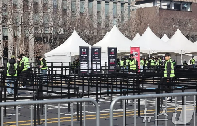 [BTSx광화문]인근지하철출입구,도로통제카페는이미만석…아직인파밀집도높진않아ⓒ뉴스1박지혜기자(서울=뉴스1)이세현권진영윤주영강서연기자=방탄소년단(BTS)의컴백공연이시작되기10시간전,광화문광장일대는이미경찰의'스타디움'관리가철저한모습이다.광화문무대를중심으로인근에철제펜스가빼곡히쳐졌고,보행자와팬들은모두금속탐지기를포함한검문을거치고있다.광화문인근거리는21일오전부터경찰과자원봉사자,통행객들로북적북적한모습이다.5호선광화문역,1·2호선시청역,3호선경복궁역은이날오후2~3시부터무정차통과가시작되지만,출입구에대한통제는이미시작됐다.출입구는역당2~3개만개방된상태로,경찰과안전요원이배치돼통행객들을안내한다.역안에는화장실과출구방향을한글과영어로인쇄한종이가곳곳에붙어있었다.출구를나온사람들은바로문형금속탐지기(MD)를포함한검문·검색을받고있었다.통행객은물론녹색조끼를입은스태프도빠짐없이검문·검색을거쳤다.게이트를통과하려면주머니에있는소지품을다꺼내고가방을열어안에든내용물에대한검사도받아야했다.아침부터광장에나온아미들은주변인근을맴도는모습이다.인근스타벅스를찾았던한팬은이미만석이라는직원의말에발길을돌렸다.세종문화회관앞계단에앉으려던사람도안전요원의조치로자리를떠났다.경찰과주최측의현장관리로현재광화문은인파가밀집되지는않은모습이다.인근도로는전날부터시행된통제가계속되고있다.사직로와율곡로,새문안로는이날밤11시까지,세종대로광화문부터시청구간은22일오전6시까지차량통행이금지된다.경찰은이날72개기동대6729명의인원을투입한다.소방당국·시·자치구인력3400여명,주최측4800여명이투입돼안전관리에만1만5000여명이동원된다.방탄소년단(BTS)완전체컴백공연을앞둔21일오전서울을지로입구역에서독일인관광객이한국경제신문의BTS특별판호외를받고있다.2026.3.21ⓒ뉴스1김진환기자[email protected]©뉴스1.Allrightsreserved.무단전재및재배포,AI학습이용금지.