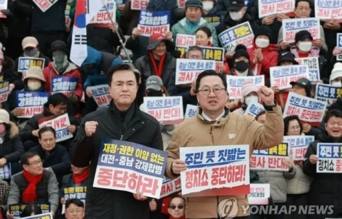 "통합했다면빚더미앉을뻔"주장에민주당"대전시부채폭탄이나걱정"이장우대전시장(오른쪽)과김태흠충남지사[연합뉴스자료사진](대전·홍성=연합뉴스)박주영김준범기자=대전시장과충남지사가전남광주통합특별시(약칭광주특별시)출범을위해지방채발행이나대출이논의되고있다는보도와관련,정부가약속을어겼다고강하게비판했다.이장우대전시장은지난15일페이스북을통해"이럴줄알았다"며"이재명정부의'5극3특'구호가얼마나허구였는지광주특별시사례가증명하고있다"고주장했다.이어"민주당의감언이설에대전과충남도졸속으로통합했더라면우리아이들에게빚더미만남겨줄뻔했다"며"대전을해체하려는시도를즉각멈추라"고촉구했다.김태흠충남지사도16일SNS에서"정부추가경정예산안에서광주·전남행정통합준비예산576억원이전액삭감됐다"며"이재명정부가균형발전의핵심으로내세운'5극3특'의첫단추를끼우기도전에비틀대고있다"고비판했다.김지사는"대전·충남통합논의과정에서정부와민주당이제시한20조원은법적근거도없고재원조달방식도불투명해도민을기만하는행위라고지적해왔다"며"도민고통과지방재정을압박하는통합은안된다"고강조했다.차담회하는조원휘대전시의회의장[촬영박주영]조원휘대전시의장도이날시의회기자실에서차담회를열고"6·3지방선거이전에통합하지않으면큰일날것처럼하더니대전충남시도민을얼마나우롱했는지증명하고있지않으냐"며"우리는이런쭉정이통합을할수없어서반대했던것"이라고말했다.통합준비예산은중동사태로인한추가경정예산목적에맞지않아삭감된것이아니냐는지적에대해서는"행정통합도불요불급한일아닌가"라면서"정부는광주·전남에약속한대로20조원이상지급해야한다"고강조했다.이와관련더불어민주당대전시당은이날논평을내고"중동발전쟁여파에신음하는민생을구하기위한전쟁추경을사기극으로몰아세우는흑색선전을즉각중단하라"고촉구했다.민주당은"이장우시장은남의집살림을걱정하기전에본인취임이후단기간에망가진대전시곳간부터돌아보라"며"2021년말8천746억원이었던대전시채무가이시장취임이후단기간에1조6천억원에육박하며두배가까이폭증했다"고지적했다.이어"자신의무능으로대전시민의어깨에'부채폭탄'을지워놓고,타지자체의재정운영에훈수를두는모습이가관"이라며"지역화폐예산이급감해캐시백혜택이8일만에소진됐는데도강건너불구경하는이시장의모습은무능행정의전형"이라고목소리를높였다[email protected]▶제보는카톡okjeboCopyright©연합뉴스.무단전재-재배포,AI학습및활용금지