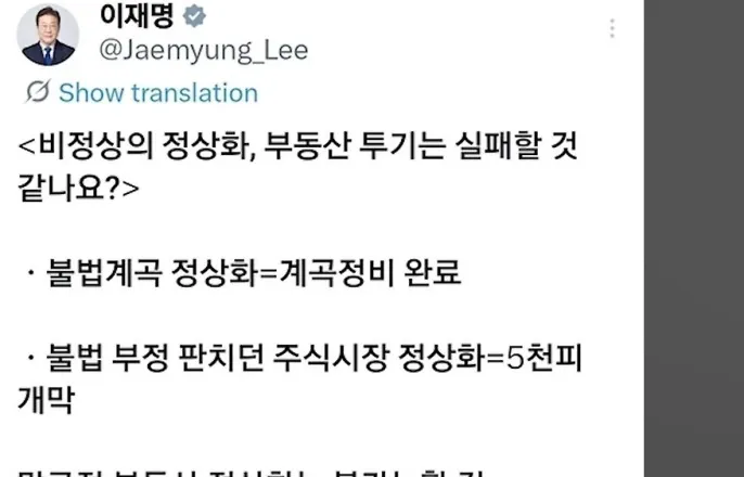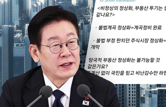 [앵커]이재명대통령이주말사이에도SNS를통해,부동산시장정상화의지를거듭드러냈습니다.무슨수를써서라도성공하겠다며,야당의지적과언론의우려를강하게비판하기도했는데요.취재기자연결해자세히알아보겠습니다.홍민기기자,이대통령이또SNS에부동산관련글을올렸다고요.[기자]네,이대통령은어젯밤11시50분쯤,자신의X계정에글을올렸습니다.어제'부동산정상화가불가능할것같으냐,계곡정비나코스피5천달성보다훨씬더쉽고중요하다'고쓴데이어,이를부연설명하는내용을재차올린겁니다.해방이후한번도성공못했을만큼어려운계곡정비,대부분헛소리로치부했던주가5천포인트도해냈다며,집값안정은무슨수를써서라도반드시성공시킬거라는뜻이라고설명했는데요.정책수단은얼마든지있지만그동안은정치적유불리때문에최적의수단을쓰지못한게사실이라며,국민을믿고정치적유불리에서벗어나면불가능한일이아니라고강조했습니다.이대통령은어제자신의말을국민의힘이'망언'이라고반박했다는내용의기사도함께공유하면서,말배우는유치원생처럼말을제대로못알아듣는분들이있다고도적었습니다.부동산정상화에대한자신감을연일강조하면서,이에대한야당의비판을재차반박한건데요.이대통령은또기회가있을때놓치지말고감세혜택을누리며다주택을해소하길바란다고강조했습니다.오는5월9일끝나는다주택자양도소득세중과유예를연장하지않겠다는뜻을거듭언급한거로해석됩니다.이대통령은오늘(1일)아침엔다주택규제로인한부작용을분석한기사를공유하고,언론이라면서대체왜이렇게망국적투기를편드는거냐고강하게비판하기도했습니다.부동산투기로인해나라가사라질지경에이르렀는데세금좀부과한것이그렇게부당한거냐고반문했는데요.그러면서정론직필은못하더라도정부에대한'억까'즉,억지비판은자중해주면좋겠다고덧붙였습니다.지금까지청와대에서전해드렸습니다.YTN홍민기([email protected])※'당신의제보가뉴스가됩니다'[카카오톡]YTN검색해채널추가[전화]02-398-8585[메일][email protected][저작권자(c)YTN무단전재,재배포및AI데이터활용금지]Copyright©YTN.무단전재및재배포금지.