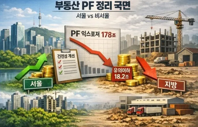 '유의이하'잔액2개분기연속감소…건전성지표도개선세"서울에만국한…지방및일부수도권,부실우려해소지연"경·공매추진11조중지방53%…물류센터토지누적도부담[출처=오픈AI]금융권의부동산프로젝트파이낸싱(PF)익스포져(위험노출액)가감소세로전환되면서양적부담이완화되는양상이다.다만서울과비서울간정리속도격차는오히려커지고있는것으로나타났다.브릿지론(본PF로넘어가기전일종의가교역할을하는자금)중심의정리가진전되는반면,지방과수도권일부지역에서는부실우려해소가지연되면서병목현상이이어질수있다는분석이다.한국신용평가(이하한신평)가14일공개한'6차부동산PF전금융권현황점검'에따르면2025년9월말기준금융권PF익스포져는178조원으로집계됐다.2023년말231조원에서감소세가지속된결과로,금융권전반이리스크관리기조를강화하며신규PF취급을축소한데더해일부업권을중심으로상각·상매각등정리노력이확대된영향으로해석됐다.[출처=한신평]특히2025년3분기에는전분기증가했던본PF가4조3000억원규모로감소전환하면서전체익스포져감소폭이확대됐다.한신평은2025년2분기총익스포져가전분기대비2%줄어든데비해3분기에는5%감소해감소세가강화됐다고설명했다.자산건전성도개선흐름을보였다.유의이하잔액은2025년3월말22조원에서6월말20조8000억원,9월말18조2000억원으로두분기연속순감소했다.유의이하잔액감소에속도가붙으면서유의이하비율은11.5%에서10.2%로낮아졌고,부실우려비율도같은기간8.1%에서7.5%로하락했다.업권별로는저축은행·여신전문금융사·상호금융권의잔액감축이두드러졌다.저축은행PF익스포져는2025년9월말9조4000억원으로2023년말22조1000억원대비57%줄었고,여전업도잔액이31%감소했다.상호금융권은2023년말전업권중최대PF잔액을보유했지만약1년9개월동안약24조원을감축하며감소폭이가장컸다고한신평은분석했다.반면은행·보험·증권업권은익스포져변동폭이제한적이었다.구조조정이시급하지않았거나재무여력을바탕으로사업성이양호한사업장을선별해신규영업을이어간결과다.특히증권업은2025년9월말PF익스포져가32조2000억원으로2023년말보다4조1000억원증가해전업권중유일하게잔액이늘었다고평가했다.다만지역별로는서울과비서울간격차가뚜렷했다.금융투자협회경·공매PF사업장정보공개플랫폼기준2025년12월말경·공매추진사업장잔액은11조1000억원으로,브릿지론9조3000억원과본PF1조8000억원으로구성됐다.분기별평균잔액은2025년2분기이후감소세를보였는데,이는브릿지론정리가꾸준히진행된영향으로분석됐다.지역별구성은서울7000억원(6%),인천·경기4조5000억원(41%),지방5조9000억원(53%)으로지방비중이가장높았다.서울비중은정리가비교적용이해하락세가지속된반면,지방비중은큰변화가없고인천·경기비중은빠르게상승해서울과비서울간격차가확대되고있다는진단이다.사업유형별로도차이가나타났다.브릿지론의경우서울지역아파트·주상복합·근린생활시설·오피스텔목적토지의정리가이어진반면,물류센터목적토지는대부분수도권에소재하고도매각되지못해잔액이2025년6월말1조원에서12월말1조4000억원으로누적되는모습이관측됐다.본PF잔액은근린·상업시설,주상복합등주거시설,기타업무시설등이약80%를차지했지만브릿지론처럼유의미한감소세가뚜렷하지않다고한신평은평가했다.제도측면에서는금융당국이부동산PF사업성평가와건전성제도개선을병행하고있다.2024년6월부터전업권에새로운사업성평가기준을적용해매분기부실우려사업장을선정,유의사업장은재구조화·자율매각,부실우려사업장은상각또는경·공매매각을추진하는구조다.또2025년12월말종료예정이던금융규제완화조치는2026년6월말까지연장됐으며,위험가중치차등화와건전성·충당금규제강화,PF대출한도·거액신용규제도입등제도개선방안도함께제시됐다.한신평은향후변수로지방부동산시장부진과시장금리움직임을지목했다.지속되는지방부동산시장부진과2025년하반기부터나타난시장금리상승등비우호적인환경이조성된만큼현재의감소추세가이어질지지켜볼필요가있다는것이다.한신평은"금융사의리스크관리기조가이어지면서전금융권의부동산PF에대한양적부담은점차축소되고있고,정리·재구조화노력이지속되며질적개선도진행되고있다"면서도"부실우려사업장측면에서는안정적인정리기조를보이는지역이서울에국한되고,서울외지역은공장·물류센터·사업부지등이여전히해소되지못하고있다"고밝혔다.이어"분기별정리·재구조화실적과매월공시되는플랫폼자료를기반으로매각추진사업장의현황을지속적으로모니터링하겠다"고덧붙였다.Copyright©EBN