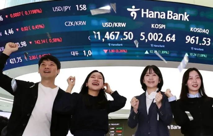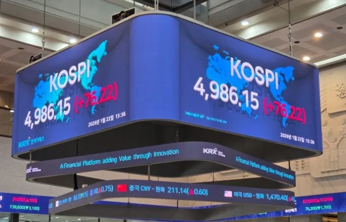 코스피,장초반5019.54기록해사상최고가다시써…외국인은3800억원매도[편집자주]머니S증권전문기자들이날마다쏟아지는이슈를깔끔하게정리해드립니다.오후도[티타임]과함께성공투자하세요./사진=이동영기자22일장초반사상최초로5000선을넘겼던코스피가외국인매도속4980선까지내려왔다.코스닥은1%넘게상승하며960선대중반을회복했다.이날한국거래소에따르면오후1시36분기준코스피는전거래일보다76.22포인트(1.55%)오른4986.15에서거래중이다.코스닥은15.34포인트(1.61%)상승한966.63에거래를이어가고있다.이날개장과동시에전인미답의5000선을넘은코스피는5019.54까지찍으며사상최고치를다시썼다.하지만이후차익실현매물과외국인의팔자속에4970선초반까지내려왔다.개인은1245억원을기관은827억원을사고있으나외국인은3805억원을팔고있다.코스피시가총액상위10개종목은상승과하락이반반이다.상위권은상승세지만방산및중공업관련주는하락중이다.삼성전자는전거래일대비5100원(3.41%)오른15만4600원에거래중이다.장중한때15만7000원까지오르며52주최고가를새로썼다.SK하이닉스도전거래일대비1만7000원(2.30%)오른75만7000원에거래를이어가고있다.최근급등했던현대차는장초반59만원을찍으며52주최고가를썼지만이후차익실현매물이겹치며하락전환했다.현대차는전거래일대비1만5000원(2.73%)내린53만4000원에거래중이다.이외에LG에너지솔루션(4.44%),삼성전자우(1.27%),SK스퀘어(2.91%)는상승중이다.반면삼성바이오로직스(4.32%),한화에어로스페이스(1.75%),기아(3.43%),HD현대중공업(3.17%)등은하락세다.코스닥은15.34포인트(1.61%)상승한966.63에거래중이다.외국인과기관매도속개인이주가상승을이끄는중이다.개인은1995억원을사들였지만외국인과기관은각각305억원과1409억원을팔고있다.코스닥시가총액상위10개종목은대부분상승세다.에코프로비엠이5.37%오른것을시작으로에코프로8.41%,에이비엘바이오2.03%,HLB6.18%,삼천당제약5.53%,코오롱티슈진8.19%,리가켐바이오0.82%,펩트론5.39%의상승률을보인다.반면최근20%넘게급락했던대장주알테오젠은전거래일대비500원(0.13%)내린37만3000원에거래중이다.레인보우로보틱스도1.75%하락세다.하나은행고시환율은전거래일대비2.70원(0.18%)오른1470.40원을나타낸다.이동영기자[email protected]©머니S&moneys.co.kr,무단전재및재배포금지