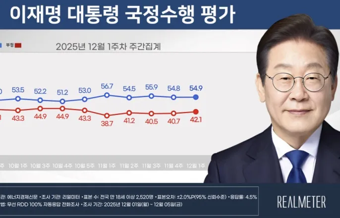 '계엄1년'성명에지지층결집·秋영장기각에하락압력…중도층57.8%지지민주44.2%·국힘37.0%…"'1인1표제'부결내홍심화"·"계엄사과거부분열"참석자발언경청하는이재명대통령(천안=연합뉴스)김도훈기자=이재명대통령이5일충남천안시한국기술교육대학교에서열린'충남의마음을듣다'타운홀미팅에서참석자발언을듣고있다[email protected](서울=연합뉴스)박재하기자=이재명대통령의국정수행지지도가54.9%로지난주보다0.1%포인트(p)소폭올랐다는여론조사결과가8일나왔다.리얼미터가에너지경제신문의뢰로지난1∼5일전국18세이상2천520명을대상으로조사한결과이대통령의국정수행을긍정평가한응답자는54.9%였다.이대통령지지도는직전조사와비교해보합권흐름을유지하며소폭상승을기록했다.부정평가한응답자는42.1%로1.4%p올랐다.리얼미터는이대통령의'비상계엄1년'특별성명과'국민주권의날'지정추진등민주주의강조메시지가지지층을결집하며주중반에60%에육박하는상승세를보였다고분석했다.하지만주후반으로넘어가면서국민의힘추경호의원구속영장기각,여당의인사청탁논란,서울기습폭설대응미흡등부정적이슈가집중되면서상승세가꺾이고하락압력이커졌다고설명했다.지역별로는보수성향인부산·울산·경남이52.9%로전주대비7.8%p오르며상승세를기록했다.마찬가지로보수성향인대구·경북도직전조사대비4.2%p상승한47.4%를기록했다.대전·세종·충청도2.7%p오른56.1%로집계됐다.광주·전라(71.9%)와서울(47.5%),인천·경기(56.8%)는같은기간각각6.6%p,2.3%p,1.6%p하락했다.연령대별로는20대지지율이지난주39.1%에서42.8%로3.7%p오르며가장큰상승세를보였다.40대(68.3%)와60대(58.3%),70대이상(50.2%)에서도각각3.5%p,2.4%p,1.2%p상승했다.30대의경우42.9%로전주대비8.3%p하락했고50대도1.9%p내린62.4%를기록했다.이념성향별로는보수층이지난주27.0%에서29.2%로2.2%p올랐다.중도층에서는57.8%로지난주보다2.0%p내렸고진보층은80.8%로변동이없었다.[그래픽]이재명대통령국정지지율추이(서울=연합뉴스)이재윤기자=리얼미터가에너지경제신문의뢰로지난1~5일전국18세이상2천520명을대상으로조사한결과이대통령의국정수행을긍정평가한응답자는54.9%였다.이대통령지지도는직전조사와비교해보합권흐름을유지하며소폭상승을기록했다.부정평가한응답자는42.1%로1.4%p올랐다[email protected](트위터)@yonhap_graphics페이스북tuney.kr/LeYN1지난4∼5일전국18세이상1천8명을대상으로한정당지지도조사에서는더불어민주당이44.2%,국민의힘이37.0%로각각집계됐다.민주당은전주보다1.4%p,국민의힘은0.4%p각각하락했다.양당간격차는지난주8.2%p에서7.2%p로좁혀졌다.리얼미터는"민주당은'1인1표제'부결로인한당내리더십타격및내홍심화,문진석의원과김남국전대통령실디지털소통비서관의인사청탁논란발생등이불거지며30대와중도층에서큰폭으로하락했다"고분석했다.국민의힘에대해서는"장동혁대표의계엄사과거부등미온적태도로계엄사죄를요구한당내의원들과의갈등및분열이지지층에혼란을초래한것으로보인다"고봤다.조국혁신당은2.6%,개혁신당은3.8%,진보당은1.4%의지지율을기록했다.두조사는모두무선자동응답방식으로이뤄졌다.대통령국정수행지지도조사의표본오차는95%신뢰수준에±2.0%p,정당지지도조사의표본오차는95%신뢰수준에±3.1%p다.대통령국정수행지지도조사응답률은4.5%,정당지지도조사응답률은3.7%였다.자세한내용은중앙선거여론조사심의위원회홈페이지참조[email protected]▶제보는카톡okjeboCopyright©연합뉴스.무단전재-재배포,AI학습및활용금지
