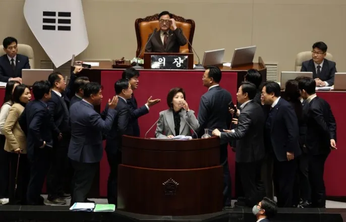 여야본회의상정법안합의실패민주당비쟁점민생법안처리野협조요구국민의힘"쟁정법안유보가먼저,모든법안에필리버스터”민주,내란재판부등사법개혁안11일부터임시국회서처리방침9일국회본회의에서국민의힘나경원의원이'가맹사업거래의공정화에관한법률일부개정법률안'에대해무제한토론을하는가운데여야의원들이발언대에서목소리를높이며신경전을이어가고있다.연합뉴스[파이낸셜뉴스]정기국회마지막날인9일개최된본회의에서여야가고성을쏟아내면서충돌하는등극한대치를이어갔다.더불어민주당이내란전담재판부설치법과법왜곡죄도입,필리버스터(무제한토론을통한합법적인의사진행방해)유지요건을강화하는국회법개정안등의처리를강조하고나서자국민의힘은맞대응차원으로모든법안에대해필리버스터에나서기로했다.여야갈등이고조되면서민주당은국회에서국민의힘규탄대회를열었고,국민의힘은모든수단을동원해저지투쟁하겠다며천막농성가능성까지언급했다.이날국회는총62건의민생법안안건등을상정했다.다만1~3번째안건인보증동의안3건만합의처리됐고,4번째안건인가맹사업법개정안이상정되자국민의힘이필리버스터에나섰다.사실상이날상정된모든비쟁점법안에필리버스터를선언한것이다.가맹사업법개정안은가맹사업자에대한가맹점주들의협상권을보장하는내용이골자다.가맹사업법개정안이여야쟁점이큰법안은아니지만민주당이내란특별재판부설치법등을강행하자국민의힘이필리버스터카드를다시꺼낸것이다.국민의힘송언석원내대표는이날본회의에앞서열린의원총회를마치고기자들과만나"쟁점이되고있는사법파괴5대악법(내란전담재판부설치법·법왜곡죄등)과국민입틀막3대악법(필리버스터제한법등),8대악법에대해민주당이강행하지않겠다는약속이없는상태에서모든법안을처리하게되면국민들에게왜우리가악법에반대하는지알릴기회가없다는지적들이많았다"며"8대악법으로인해대한민국헌정기본질서가완전히붕괴되는것에대해소상히알려드리는차원에서쟁점이많지않는법안에대해서도필리버스터를실시하게됐다"고말했다.필리버스터첫주자는국민의힘나경원의원이맡았다.여야는필리버스터시작부터목소리를높이며극심한신경전을펼쳤다.우원식국회의장이연단에오른나의원을향해"인사안합니까"라고하자,나의원은"조금이따말씀드리겠다"고맞받았다.이에민주당의원들은"정신차려","인사해라"고지적했고,국민의힘의원들은"조용히하라"고맞섰다.이후에도필리버스터진행을두고여야간고성이한동안지속되는등파행을빚었다.이날밤12시가지나면정기국회가종료되는만큼필리버스터는자동종료된다.이에따라가맹사업법개정안은오는11일열리는본회의에서처리될것으로예상된다.민주당문금주원내대변인은이날기자들과만나"다음본회의는오는11일예정으로그날가맹사업법개정안을표결처리하기로했다"면서"11일부터14일까지4일정도본회의를할것으로예정하면우리당이원하는법안을3개정도올려(국민의힘이)필리버스터를하더라도꼭통과시키는전략으로할것"이라고말했다.다만아직어떤쟁점법안을상정할지정해지지는않은것으로전해졌다.이에여야대치국면은당분간지속될전망이다.민주당은이날상정된모든법안에필리버스터를결정한국민의힘을규탄하고나섰다.민주당정청래대표는"12·3비상계엄이1년지났지만반성과성찰없이지금도마구잡이'윤어게인'을외치는국민의힘을보면서이제측은한마음까지든다"며"이재명죽이기에골몰했던내란세력은단한마디의반성도없다"며비판했다.그러면서"세상에민생법안에대해필리버스터를하겠다는이해괴망측하고기상천외한국민의힘,국민여러분은용서하지말아야한다"며"민생발목잡기를넘어서이것은민생탄압이고민생쿠데타"라고했다.국민의힘도강경대응을예고하고있다.민주당의사법파괴·입틀막8대악법저지를위한투쟁의일환으로천막농성도검토중이다.이와관련해송원내대표는"그부분은아직최종적으로정리된내용은아니라답변을자제하겠다"고했다.민주당과합의가능성에대해선"본회의장안에서만날기회가있을것"이라며"정기국회가종료되면필리버스터가종료되고산회하기때문에이후임시국회를언제,어떻게열것인지에대해최종적으로만나조율할예정"이라고설명했다[email protected]최종근이해람김형구기자Copyright©파이낸셜뉴스.무단전재및재배포금지.