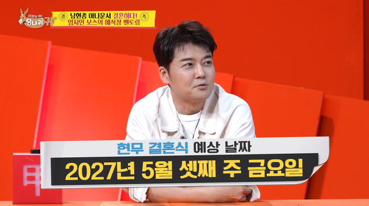전현무가신부는없지만내년5월결혼을계획했다.iMBC연예뉴스사진iMBC연예뉴스사진iMBC연예뉴스사진19일방송된KBS2TV'사장님귀는당나귀귀'에서는엄지인이남현종을위해예식장투어를준비했다.이날박명수는엄지인이요즘예식장예약이어렵다고하자전현무에게"결혼식날짜미리정해놓자"고제안했다.전현무는"내년5월셋째주금요일로해달라"고하며스몰웨딩과호텔웨딩중"무조건빅이다.어떻게하는결혼인데,내사전에스몰은없다.전국에있는미디어다부를거다"고했다.이어그는"하객은1천명이상될것같다.뿌린게얼만데"라고하며"박경림씨결혼식에5천명이왔다고하는데능가해보려고한다"고해웃음을자아냈다.한편KBS2TV'사장님귀는당나귀귀'는매주일요일오후4시40분방송된다.iMBC연예백아영|사진출처KBSCopyright©MBC연예.무단전재및재배포,AI학습금지.