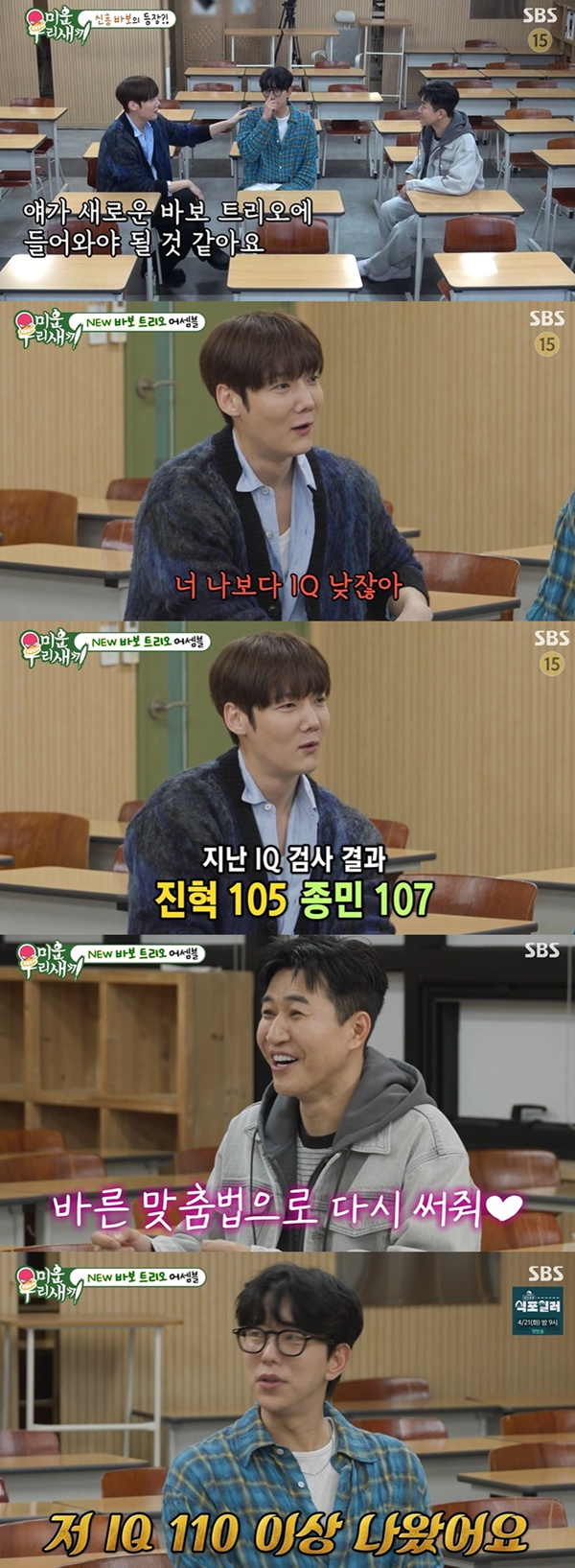 미우새최진혁윤현민김종/사진=SBS캡처[스포츠투데이임시령기자]'미운우리새끼'김종민이최진혁보다IQ가높다고자랑했다.19일방송된SBS예능'미운우리새끼'에서는최진혁,윤현민,김종민의회동이그려졌다.이날최진혁은"저는어느정도똑똑해져서얘가새로운바보트리오로들어와야한다"고윤현민을바라보며말했다.김종민은최진혁에게"탈출하려면나부터탈출해야한다.너나보다IQ낮지않냐.내가107나오고,저는105나오지않았냐"고해웃음을안겼다.최진혁이"형수님한테맞춤법지적당하지않냐"고하자김종민은"맞춤법은틀려도얘기잘안한다.바르게다시써준다"고너스레를떨었다.이에최진혁은"아직바보계를은퇴하기엔너무창창하다"고놀렸다.그러던중윤현민이"저는IQ110이상나왔다"고자랑해모두를놀라게했다.[스포츠투데이임시령기자[email protected]]Copyright©스포츠투데이.무단전재및재배포금지.