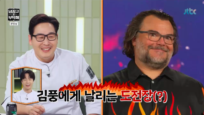 방송시청후작성된리뷰기사입니다.[OSEN=박하영기자]‘냉장고를부탁해’김풍이잭블랙에게샤라웃받아모두를놀라게했다.19일방송된JTBC‘냉장고를부탁해’(이하‘냉부해’)에서는할리우드배우잭블랙의영상편지가깜짝공개됐다.이날‘냉부해’에는잭블랙의영상편지가도착해눈길을끌었다.잭블랙은“안녕하세요.한국팬여러분.그리고‘냉장고를부탁해’팀여러분”이라고인사했다.무엇보다그는김풍을언급하며“김풍세프님의요리스타일이저랑비슷하더라.창의적이고대담하고에너지가넘친다”라고말했다.김풍요리에대해잭블랙은“사람들이가진재료로상상치도못한요리를만들어내는게좋다.그게훌륭한요리의본질이죠”라고칭찬했다.이를본윤남노는“형이저정도냐”라고놀랐고,최현석은“창의적이고대담하고이런건제가추구하는요리인데왜김풍한테갔냐”라고의아해했다.김풍은잭블랙에게“하이잭블랙?아임김풍땡큐쏘머치굿.아임유어빅팬”이라고영어로화답하다“한번나오세요.세프님들이맛있게할테니까나오셔라”라며한국말로초대해웃음을자아냈다./mint1023/@osen.co.kr[사진]‘냉장고를부탁해’방송화면캡처Copyright©OSEN.무단전재및재배포금지.