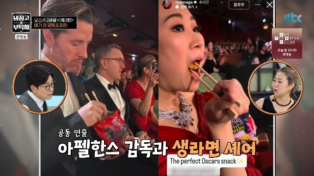 JTBC‘냉장고를부탁해since2014’캡처JTBC‘냉장고를부탁해since2014’캡처[뉴스엔서유나기자]'케이팝데몬헌터스'매기강감독이오스카시상식에서생라면먹방을한비화를공개했다.4월19일방송된JTBC예능'냉장고를부탁해since2014'(이하'냉부')67회에는제98회아카데미시상식2관왕을차지한애니메이션영화‘케이팝데몬헌터스’(이하'케데헌')의감독매기강과'SodaPop'(소다팝)안무가리정이게스트로출연했다.이날김성주는오스카시상식도중올라온사진한장이화제라며매기강이시상식도중생라면을먹방한사실을언급했다.당시'완벽한오스카간식'이라고하면서먹방영상까지게재한매기강.매기강은"합성아니다.하나나눠먹었다.시상식에테이블도없고음식을안준다.엄청길지않냐.4시간정도하는데스낵이팝콘,물한병,사탕만주더라.배고프잖나.생라면을가서먹을까하고젓가락도드레스안에숨겨갔다"고밝혔다.두MC가라면먹을생각에가져가신거냐며놀라워하자매기강은"그럼요"라고답했다.이어"다행히제가빨간드레스입어서매칭이되더라.핸드백처럼들고들어갔다"고너스레떨어웃음을자아냈다.뉴스엔서유나stranger77@기사제보및보도자료[email protected]ⓒ뉴스엔.무단전재&재배포금지Copyright©뉴스엔.무단전재및재배포금지.