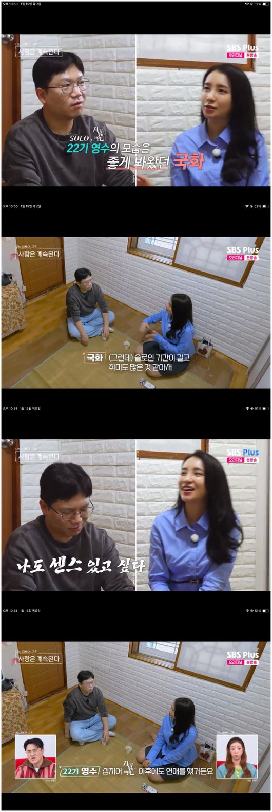 <리뷰:방송시청후작성된리뷰기사입니다.>[OSEN=오세진기자]‘나는SOLO,그후사랑은계속된다’국화가22기영수와의대화에호감이높아졌다.15일방영한ENA,SBSPlus예능‘나는SOLO,그후사랑은계속된다’(이하‘나솔사계’)에서는첫인상선택을했던국화와22기영수와호감을확인했다.첫인상선택은수월했으나90년생인국화가10살내외의남성을선호한단말에22기영수는포기를외쳤던것이다.그러나그는주저하지않고대화를신청했고,국화와제법이야기가잘통했다.미스터킴의직진이있음에도국화는"감사하지만첫날부터이미지가굳어지긴싫다"라며자신만의의견을전했다.이어국화는“22기영수가나온방송을다봤다.저는나온게다귀여워보였다.사실솔로로오래사셔서취미가많을거같았고,저사람의삶에내가들어갈수있을까,이게고민이됐다.그리고보여지는건좀차가워보였다”라며현실적인이야기를꺼냈다.22기영수는“충분히그렇게보일수있다.저는사근사근한편은아니다.그래도저는여행프로그램나온후연애도했다”라며자신의센스없음에대해살짝아쉬워했다.국화는“제가이야기하는것에대해그걸들어주더라.그냥‘그게뭐’이럴수있는데그럴수있다고하더라.첫인상선택때쌍화차데이트를했던것보다훨씬더호감이높아졌다"라며22기영수에대해마음을밝혔다./[email protected][사진출처]ENA,SBSPlus예능‘나는SOLO,그후사랑은계속된다’Copyright©OSEN.무단전재및재배포금지.