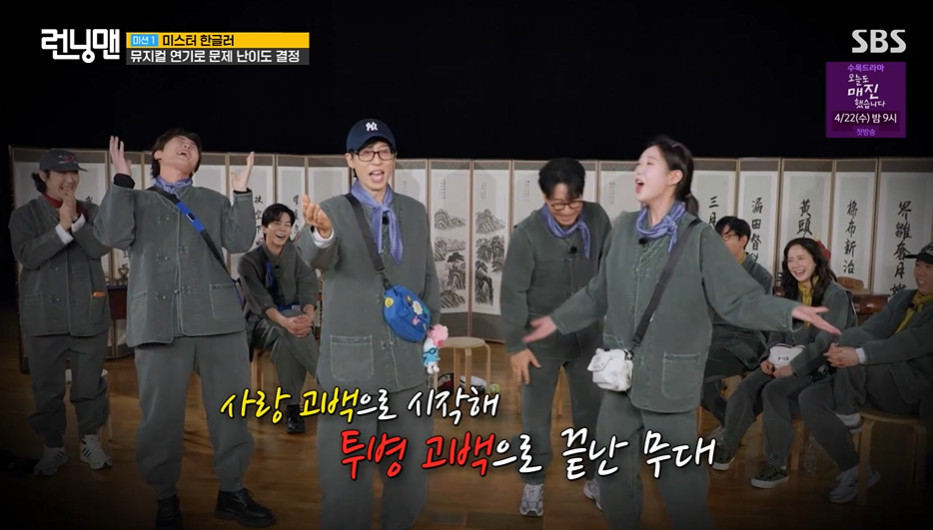'런닝맨'19일방송SBS'런닝맨'갈무리(서울=뉴스1)김민영기자=뮤지컬배우박은태가명품즉흥연기를펼쳤다.19일오후방송된SBS예능프로그램'런닝맨'은'런닝데이즈:암호명R'특집으로꾸며졌고게스트로뮤지컬배우신성록,유준상,박은태가출연했다.첫번째로노래를듣고즉흥뮤지컬연기를해야하는미션이주어졌다.박은태는유재석,지예은,지석진과팀이되었고흘러나오는'아내의유혹'음악에맞춰지예은과즉흥뮤지컬연기를펼쳤다.지예은은노래가나오는동시에"아니야!"라고소리쳤고박은태는"누굴만난거야"라며지예은이바람을친것처럼받아쳤다.이에지석진이내가지예은의새로운남자라고애기했고"내가연하다"라고도얘기해시청자들을폭소하게했다.유재석이지석진에게"이사람관절염있다"라고얘기하자박은태와지예은은관절염을주제로즉흥뮤지컬노래를만들어웃음을안겼다.결국박은태가속한'파랑팀'은미션에서1등을차지했다[email protected]©뉴스1.Allrightsreserved.무단전재및재배포,AI학습이용금지.