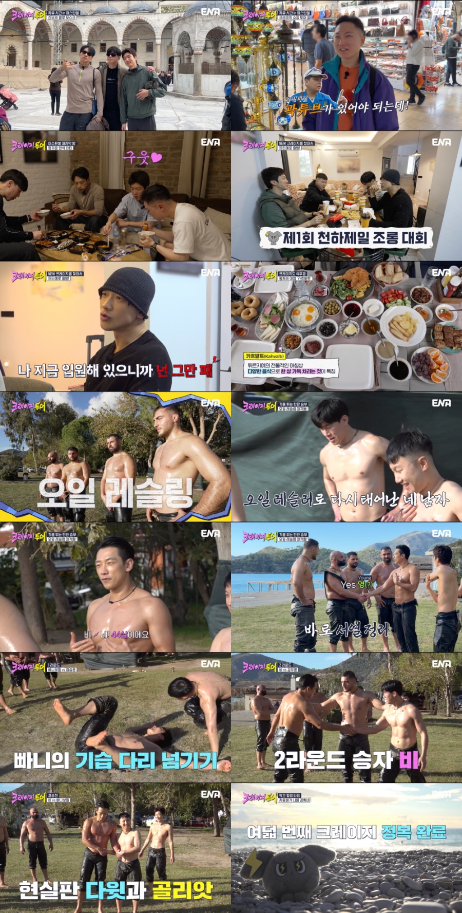 비(정지훈)가오일레슬링챔피언앞에서K-서열정리에나섰다.iMBC연예뉴스사진18일방송된ENA'크레이지투어'8회에서는이스탄불에서의마지막자유시간과새로운목적지페티예에서의8번째크레이지미션이펼쳐졌다.먼저비(정지훈)X김무열X빠니보틀X이승훈(WINNER)은각자의방식대로마지막시간을즐겼다.이스탄불대표명소'블루모스크'를찾은'크레이지4맨'은수만장의푸른타일과장엄한돔,빛을머금은스테인드글라스가어우러진신비로운공간에"언빌리버블","압도적이다"라며감탄을쏟아냈다.경건한분위기속에서잠시'크레이지'를내려놓은멤버들의시간은색다른힐링을선사했다.새집인테리어에'미친'빠니보틀은또다시그랜드바자르로향했다.하지만형형색색현란한튀르키예조명에온신경을빼앗긴그를정신차리게한것은예상밖의살벌한가격.결국"18세기오스만스타일"이라며가게직원이추천한비교적저렴한감성조명으로적정선을찾았지만,이번엔흥정이문제였다.자신이야심차게제시한금액을직원이두말없이흔쾌히수락하자,뭔가잘못됐다는걸느낀것.'흥정머신'곽튜브를그리워하는빠니보틀의씁쓸한얼굴이웃음을자아냈다.이스탄불에서의크레이지미션2개를완료한멤버들은다음여정을위해세계3대패러글라이딩명소이자지중해의낙원인'페티예'로이동했다.페티예에도착한첫날,김무열이예약한수영장과사우나까지완비한초호화숙소에감탄한것도잠시,우천으로뜻밖의자유시간이주어지자그새를참지못하고비가게임에돌입했다.하지만이때만해도본인이제안한천하제일조롱대회가자승자박이될줄은꿈에도몰랐다.마치기다렸다는듯'타격감맛집'인형비에게'조롱력MAX'의동생이승훈과'수발러'동생빠니보틀까지무차별디스를퍼부었고,급기야비는"나입원했으니,그만패라"라고호소하는지경에이르렀다.현장이폭소로초토화된가운데,메모지게임,팔씨름등끝없는미니게임까지이어지며멤버들은자유시간마저'크레이지'하게채웠다.드디어8번째미션의날,에메랄드빛욀뤼데니즈해변의장관에감탄하던그때,이들앞에무시무시한장정4인이등장했다.바로튀르키예국민스포츠'오일레슬링'선수들.멤버들이도착하자마자선수들은'오일레슬링'시범경기를선보였고,무엇보다멤버들은온몸에오일을바른채바지안으로깊숙이손을넣어상대를제압하는파격기술에넋을잃고말았다.게다가오일레슬러전용바지'키스펫'을착용하는과정부터난관이었다.뻣뻣하고두꺼운소가죽으로만들어진바지에다리를구겨넣느라여기저기서비명이난무한것.김무열은"갑옷같다"라며혀를내둘렀고,빠니보틀은"살면서이런옷은처음"이라며당혹감을감추지못했다.우여곡절끝에환복을마친비는25년경력의챔피언'다우붓'이35세라고밝히자마자,"나44살이다!"라며기선제압용K-서열정리에나섰다.능청스러운큰형님포스는긴장된분위기를완화시켰고,여기에유독몸이하얀두'백설기'동생들은순식간에분위기를폭소로반전시켰다.본격대결에앞서,바지춤잡고번쩍들어내려치기,바지속에손을넣어잡고넘기기,다리사이를잡아들기등각종기술을전수받는과정에서,우람한'삼촌'선수들이귀여운'조카'빠니보틀과이승훈을놀아주는것같은장면이연출된것.그리고드디어고대하던대전이시작됐다.1라운드에선이승훈이시작부터꼬집기등더티플레이로경고를받는사이,빠니보틀이기습다리공격으로승리,'작은거인'의괴력(?)을입증했다.이어진2라운드는'운동광인'비와김무열의자존심을건대결이었다.김무열의저돌적인헤드록공격에위기를맞았던비는순간적인힘을폭발시켜김무열을내리꽂으며승기를잡았다.하이라이트는단연비와다우붓의대결.챔피언을상대로비는끝까지물러서지않는투지를보이며접전을펼쳤지만,연속경기로인한체력소진끝에아쉽게패배했다.하지만굴욕적인자세도마다하지않는투혼으로현지레슬러들의박수갈채를받았다.방송말미에는다음주방송분으로'지옥의오션뷰헬스장'개장,튀르키예식전통목욕과함께'멤버들전원이함께이륙'하는전무후무한스페셜패러글라이딩미션이예고됐다.한편"세상에없던방식"이라는설명과함께,전멤버가다같이절벽을향해질주하는역대급크레이지예상되는ENA'크레이지투어'는매주토요일저녁8시30분에방송된다.iMBC연예백아영|사진출처ENA,TEOCopyright©MBC연예.무단전재및재배포,AI학습금지.