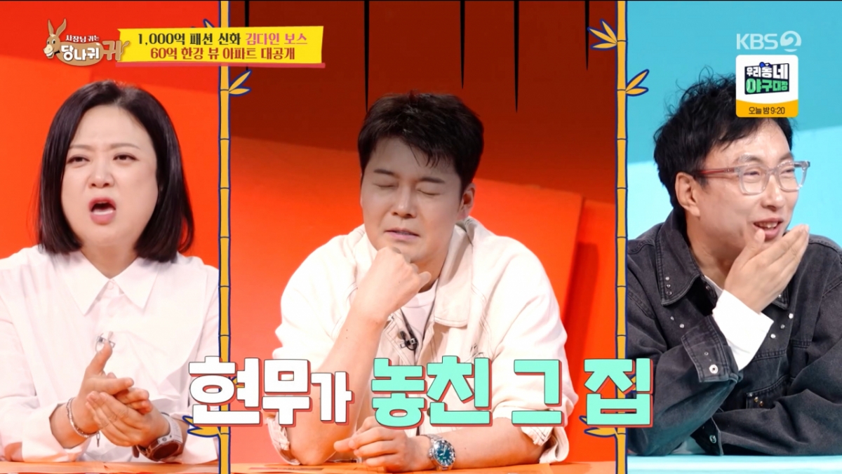 [스타뉴스|노미경기자]/사진=KBS'사장님귀는당나귀귀'방송인전현무가놓친60억원대한강뷰아파트의정체가공개됐다.19일방송된KBS2TV예능프로그램'사장님귀는당나귀귀'(이하'사당귀')에서는'1000억패션신화'의주인공김다인대표의일상이그려졌다.이날방송에서는방송인박명수와오마이걸효정이김다인대표의집을직접방문하는장면이공개됐다./사진=KBS'사장님귀는당나귀귀'입구부터럭셔리한분위기를풍기는김다인대표의집을본박명수는"이집한번정말와보고싶었다"며설레는마음을드러냈고,효정역시"처음와본다"며감탄사를연발했다.박명수는"이렇게좋은기회를주셔서감사하다"라며분위기를띄웠다.특히박명수는효정에게거실너머펼쳐진풍경을가리키며"여기한강뷰가기가막히거든,한번봐봐"라며기대감을높였다.이를스튜디오에서지켜보던전현무는"아,그집이구나"라며단번에집의위치를알아챘다.이에박명수는기다렸다는듯"이거원래현무가살집이었어"라고말해전현무를머쓱하게만들었다.해당아파트는전현무가과거매수기회를놓친것으로알려진곳으로,현재매매가60억원을호가하는초고가주택이다.압도적인한강전망까지더해지며출연진들의감탄을자아냈다.노미경기자[email protected]©스타뉴스&starnewskorea.com,무단전재및재배포금지