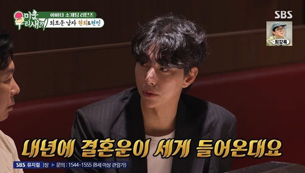 SBS‘미운우리새끼’캡처SBS‘미운우리새끼’캡처[뉴스엔유경상기자]윤현민이아바타소개팅에임하는각오로내년결혼운을말했다.4월26일방송된SBS‘미운우리새끼’에서는임원희,윤현민이아바타소개팅을했다.탁재훈,김희철이두사람을아바타로조종했다.윤현민은아바타소개팅이처음이라며“소개팅을한번도해본적이없다.저는대학을안갔기때문에.중고등학교도남자학교를나왔다”며“얼마전에사주를봤는데내년에결혼운이세게들어온다고한다”고말했다.탁재훈은윤현민이소개팅이처음이라는말에그건네사정이라며선을그었고“말을하면허당이니까말을하지마라”고엄명을내렸다.윤현민은지난‘미우새’방송을통해백치미를뿜어냈던상황.윤현민모친은“저걸보고시장에서‘현민이어머니아니세요?’그러면아니라고했다”고아들의백치미에탄식했다.서장훈은“소개팅에서는허당인것알아도상관안할거”라며윤현민의외모와매력으로충분히만회가능하다고봤고,차태현도“잘생겼잖아”라며동의했다.신동엽도“저렇게잘생기고저렇게운동을잘하는데”라며같은의견을냈다.이어탁재훈은임원희에게“넌준비를하고온거냐.옷갈아입고와라”고핀잔했다.임원희는“이게준비한거다.이상민옷이다.이상민에게산옷”이라고어필했다.탁재훈은“이게웬황토방이냐”고탄식했지만임원희는“나름꾸안꾸스타일”이라고주장했고모벤져스도“본중에제일낫다”고임원희의옷차림을칭찬했다.뉴스엔유경상yooks@기사제보및보도자료[email protected]ⓒ뉴스엔.무단전재&재배포금지Copyright©뉴스엔.무단전재및재배포금지.