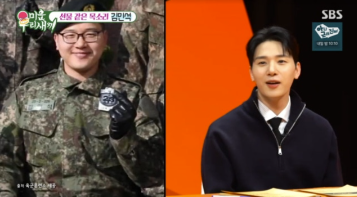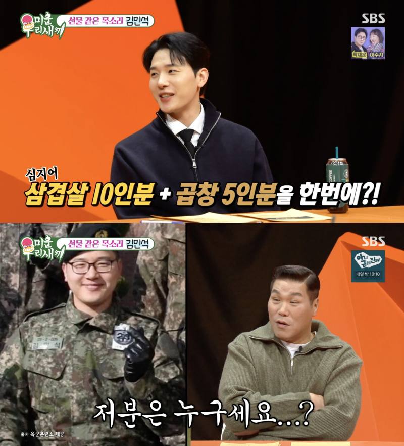 ⓒSBS'미운우리새끼'[스포츠한국신영선기자]그룹멜로망스김민석이잔뜩먹어행복하게살이오른상태에서입대한과거사진을공개했다.8일방송된SBS'미운우리새끼'에서는김민석이게스트로출연해365일다이어트중이라고말했다.대식가라는김민석은"2주동안10kg이쪘다"며삼겹살10인분과곱창5인분을한번에먹은적이있다고밝혔다.그는"그때도심지어다이어트기간이었다.한때황제다이어트가유행했다.단백질만먹으면살이빠지는줄알고고기만그렇게먹었는데그렇게많이먹으면안빠진다더라"고전했다.이어"혼자기름통을비우는게처음이라고하셨다.지금은그렇게안먹는다"고덧붙였다.서장훈은김민석의군복무시절사진을보고지금과는전혀다른통통한얼굴과몸집에깜짝놀라"저분은누구냐"고물었다.김민석은"저때가조금빠진건데96kg이었다"면서"살이많이찐상태에서입대하니까'26번훈련병김민석맞아?''쟤가멜로망스김민석맞아?'라고했다"고밝혔다.그는"군대가기직전에먹고행복하게활동하자고해서막불어나서최고불어난상태에서입대했다"고설명했다.서장훈은김민석의설명에도"저때는찾으라고해도누군지못찾겠다"며이해할수없다는반응을보였다.이에신동엽은사진속김민석의표정이너무나행복해보인다고짚어웃음을자아냈다.스포츠한국신영선기자[email protected]©스포츠한국.무단전재및재배포금지.