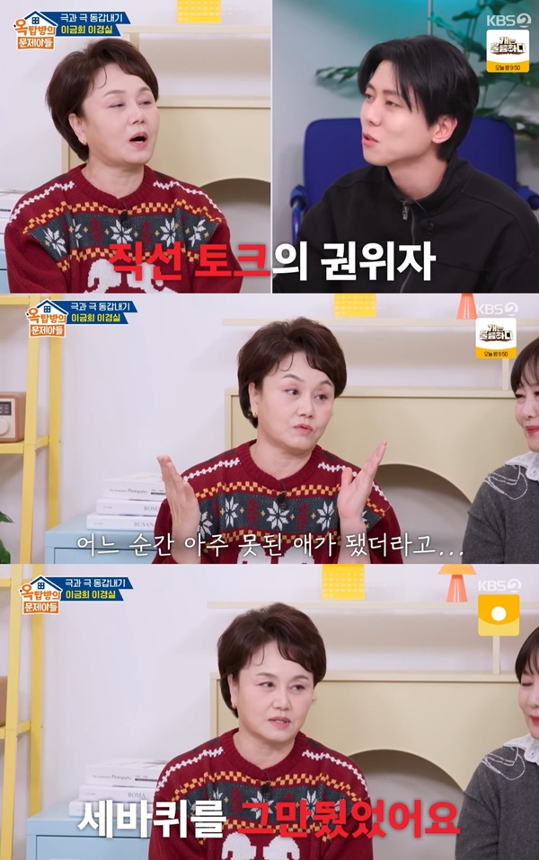 '옥탑방의문제아들'11일방송KBS2TV'옥탑방의문제아들'캡처(서울=뉴스1)이지현기자=이경실이'세바퀴'에서자진하차한이유를고백했다.11일오후방송된KBS2TV예능프로그램'옥탑방의문제아들'에는코미디언이경실이아나운서이금희와동반출연한가운데거침없는입담으로웃음을안겼다.MC인모델겸방송인주우재가유독긴장한모습을보였다.그이유를묻자,이경실을가리키며"내가하는'직선토크'의꼭대기에있는분이라서"라고털어놨다.KBS2TV'옥탑방의문제아들'캡처이경실이입을열었다."예전에는토크를좀세게하는게받아들여졌다"라고회상했다.이어과거출연했던예능'세바퀴'를언급하며"'세바퀴'출연할때(재미를위해)세게말하고,예능캐릭터로그렇게했는데,어느순간내가아주못된애가돼있더라"라고밝혔다.특히이경실이"점점토크를순화했는데,한번은'세바퀴'제작진이싹바뀌었다.그때제작진입장에서는더재밌게하고싶으니까,날악녀로만들더라.'더는못하겠다'해서'세바퀴'를그만뒀다.그래서다른사람보다'세바퀴'를일찍그만두게된것"이라며자진하차하게된배경을전했다[email protected]©뉴스1.Allrightsreserved.무단전재및재배포,AI학습이용금지.