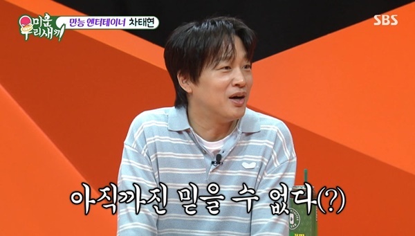 SBS‘미운우리새끼’캡처SBS‘미운우리새끼’캡처[뉴스엔유경상기자]차태현이절친김종국의결혼을아직못믿는다고말했다.4월26일방송된SBS‘미운우리새끼’에서는배우차태현이출연했다.서장훈은차태현에게“김종국결혼이아직도가짜라고생각한다고?”라고질문했고,차태현은절친김종국결혼에대해“일단결혼식에서만봤고요.그냥세트에서사는것같다.아직그집을가본적도없고.그집을가기전까지는믿을수없다”고말해웃음을자아냈다.허경환모친이“우리도그렇다”고동의하자차태현은“그렇죠?전국민이꿈을꾼것같다”고너스레를떨었다.신동엽이“결혼하면집들이를하는데.요즘은잘안하지만.그런게없어서가짜다?”라고다시묻자차태현은“그런게전혀없어서믿지않고있다.그런데최근에2세계획을하고있다고.이야기는했지만믿고있지는않다.아무튼그렇다고한다”고말해웃음을더했다.뉴스엔유경상yooks@기사제보및보도자료[email protected]ⓒ뉴스엔.무단전재&재배포금지Copyright©뉴스엔.무단전재및재배포금지.