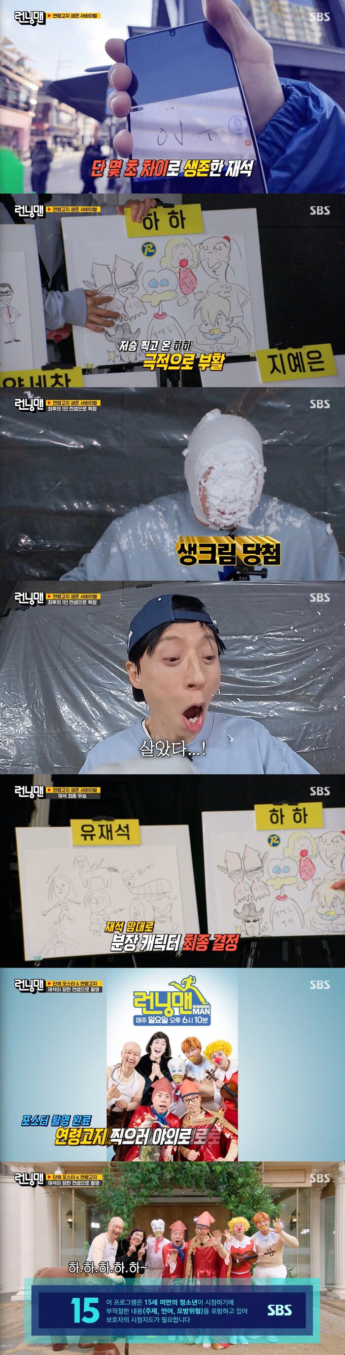 [SBS연예뉴스|김효정에디터]유재석이포스터컨셉최종승자가되었다.8일방송된SBS'런닝맨'에서는포스터와연령고지촬영컨셉이공개됐다.이날방송에서는지난두번째미션의승자가유재석으로밝혀졌다.지석진의방해공작에도불구하고간발의차이로유재석이먼저하하태블릿에아웃을적었던것.이에유재석은지석진을향해"형은반인반수확정이야"라며복수를예고했다.두번째미션에서승리한유재석은다른멤버들의컨셉중하나만남겼다.차례대로탈락시키고하하의컨셉만남긴유재석.그리고최종선택은복불복으로진행됐다.유재석과하하가생크림폭탄복불복을해서최종컨셉을정하게된것.이에유재석이선택권을가졌다.그런데생크림폭탄이발사되기도전에유재석이선택한것에서생크림이새어나와불안함을조성했다.하지만유재석은선택을바꾸지않았다.그결과최종우승은유재석이었다.우승한유재석은자신마음대로캐릭터를설정했다.이에그는지석진에게는하하가정했던할아버지캐릭터에반인반수를합친캐릭터를정해주었다.그리고지예은과송지효,김종국도하하가정했던둘리속캐릭터들을그대로쓰기로했다.또한하하는하하의어머니인융드옥정캐릭터를부여해폭소를자아냈다.마지막으로본인은양복을입겠다고선언했다.하지만멤버들의야유속에꼴뚜기왕자를하기로결정해양세찬과함께꼴뚜기분장을했다.스태프들의공들인분장으로완벽하게캐릭터로변신한멤버들은포스터와연령고지영상을순조롭게완성시켰다.한편이날진행된2의게임레이스에서는2의남자홍진호가상품의주인공이되어이베리코돼지세트를선물로받았다.그리고오랜만에김종국이벌칙자가되어눈길을끌었다.Copyright©CopyrightⓒSBS.Allrightsreserved.무단전재,재배포및AI학습이용금지