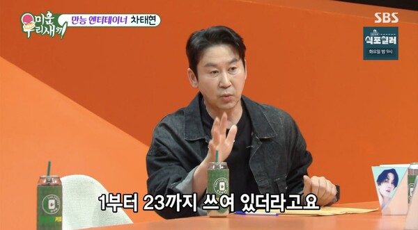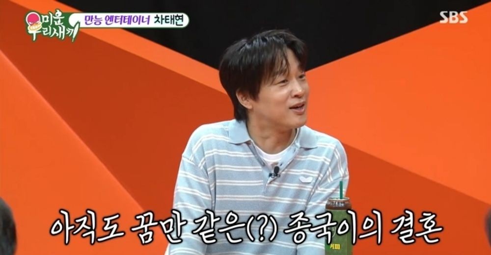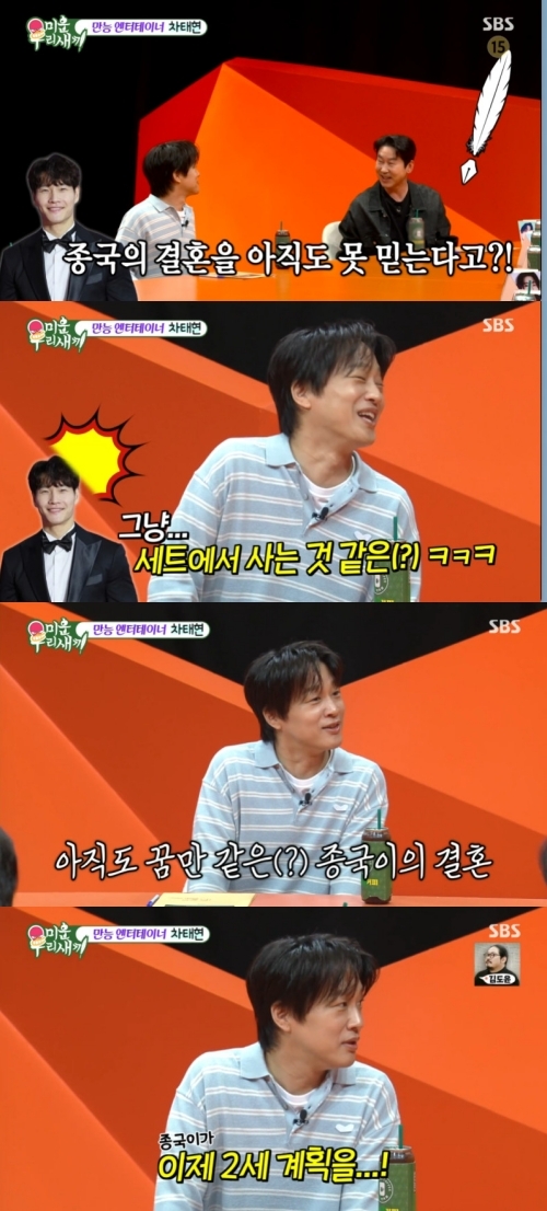 ‘미운우리새끼’사진|SBS차태현이절친김종국의결혼이믿기지않는다고말했다.26일오후방송된SBS예능프로그램‘미운우리새끼’(이하‘미우새’)에는만능엔터테이너차태현이출연했다.이날방송에서차태현은김종국의결혼을믿지않는다며“(신부를)결혼식에서만봤다.세트에서사는것같다.아직신혼집을가본적도없다”고말했다.허경환어머니가“우리도그렇다”고하자차태현은“그쵸?전국민이꿈을꾼것같다.근데최근핫한소식은종국이가2세계획을하고있다는거다.그렇지만이것도믿지는않는다”라고말해웃음을자아냈다.‘미운우리새끼’는일요일오후9시5분SBS에서방송된다.[서예지스타투데이객원기자]Copyright©스타투데이.무단전재,재배포및AI학습이용금지
